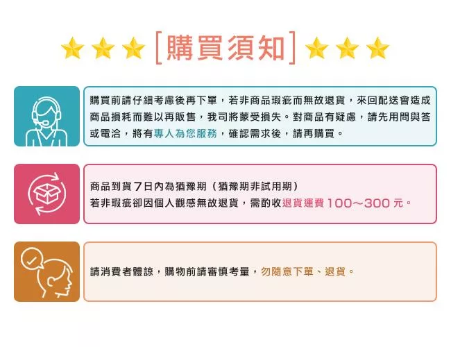 ※購買前請仔細考慮後再下單,若非商品瑕疵而無故退貨,來回配送會造成商品損耗而難以再販售,我司將蒙受損失。對商品有疑慮,請先用問與答或電洽,將有專人為您服務,確認需求後,請再購買。