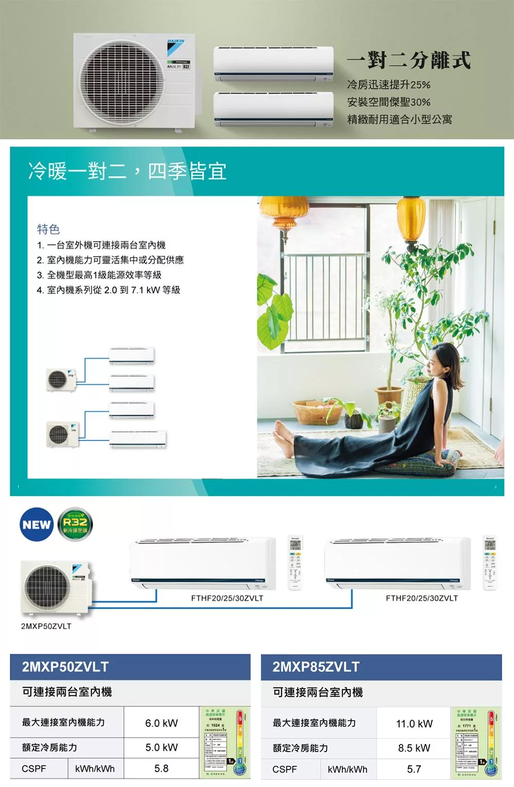 DAIKIN大金4坪+5坪一對二變頻冷暖分離式冷氣2MXP50ZVLT/FTHF25ZVLT+FTHF30ZVLT