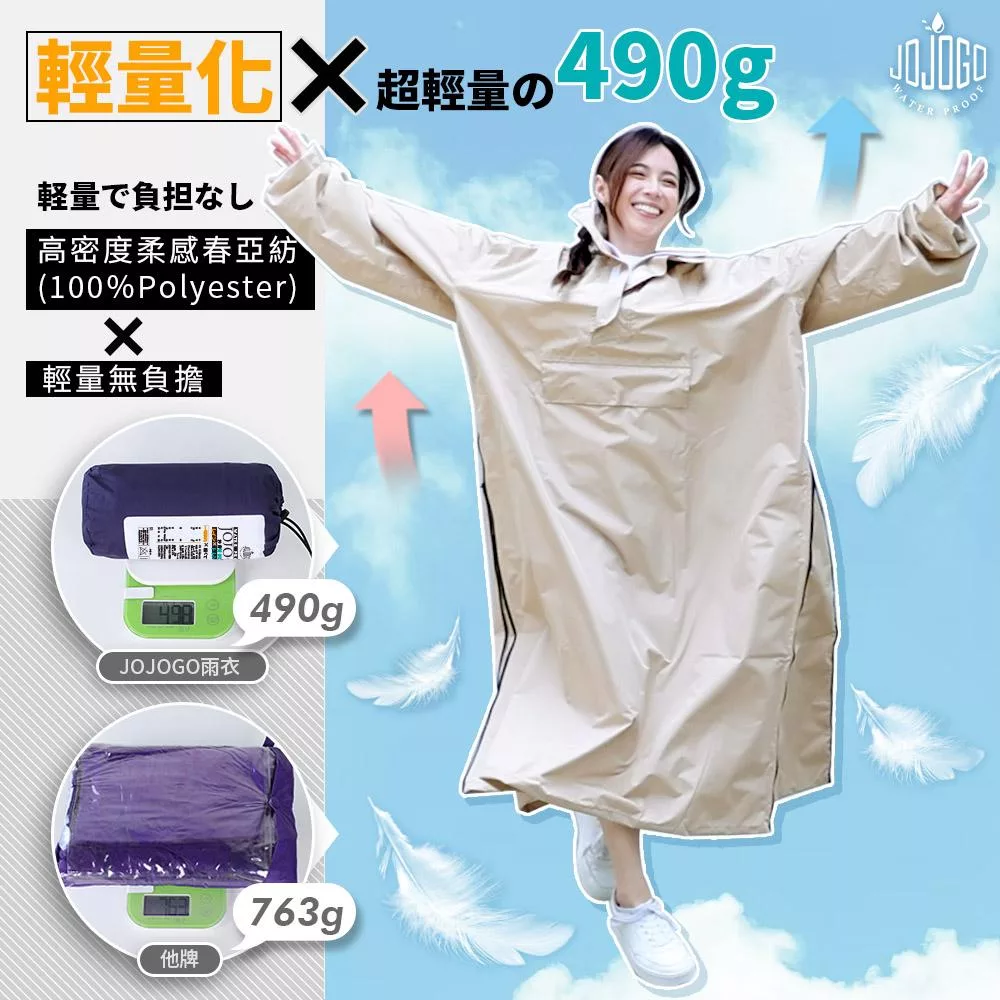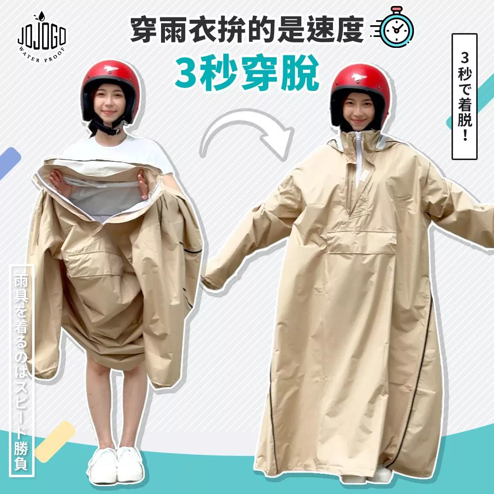 套頭式5秒速穿雨衣,免摘安全帽!前片一體式設計,前跨不再濕。一甩就乾的防潑水處理,擺脫夏日悶熱的超防水時尚雨衣!