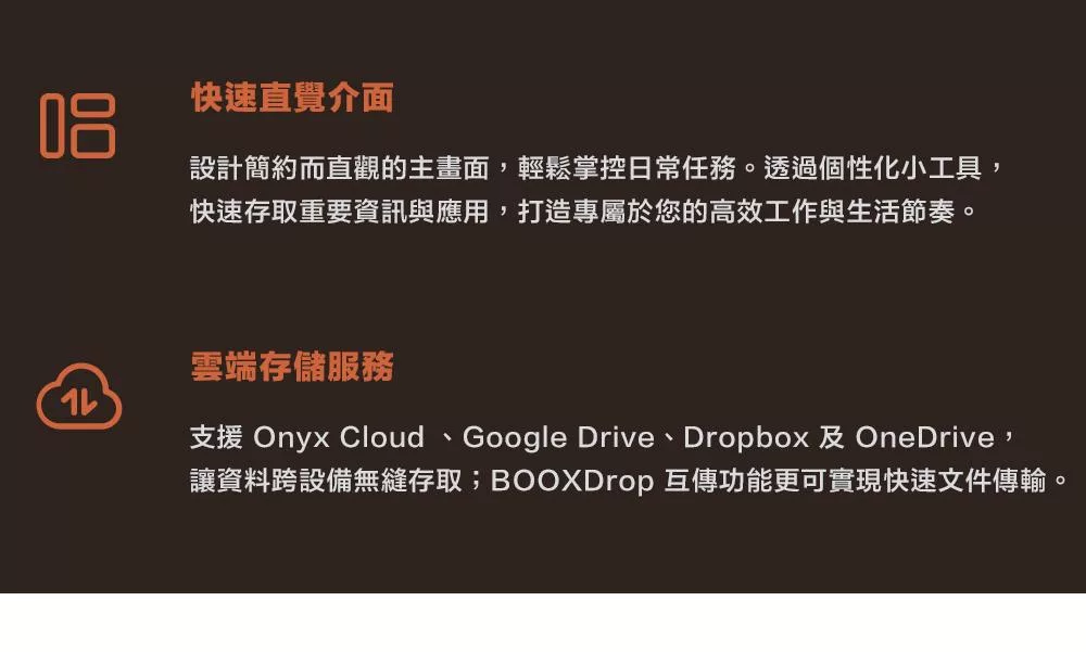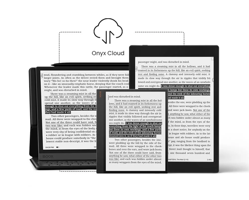 BOOX 提供所有使用者 Onyx Club 雲服務免費使用 10GB 雲端空間,利用 Onyx Cloud 雲服務可以很方便將閱讀器上的手寫筆記同步到電腦上,也可以將在電腦上正在看的網頁立即同步到閱讀器上繼續瀏覽。Onyx Cloud 雲服務讓你輕鬆完成同步作業。