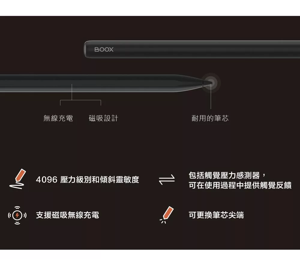 BOOX InkSpire 主動式電容手寫筆為每個靈感瞬間⽽⽣。精準捕捉每⼀筆劃,以 4096 級壓力感應、傾斜檢測與觸覺回饋技術,為書寫和繪圖帶來猶如紙上作業的自然手感。磁吸無線充電的設計,更讓筆與平板間的互動毫不費力。