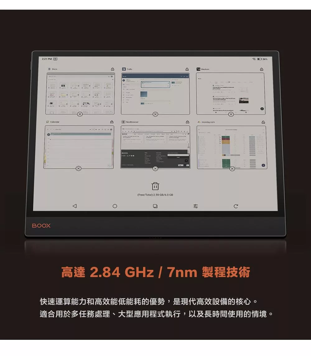 搭載八核心處理器與 6GB 記憶體,能夠快速處理複雜任務,讓切換工作與休閒變得輕而易舉。搭配 BOOX 獨家 Super Refresh Technology 快刷技術 (BSR),讓複雜的數據分析到網頁瀏覽,流暢的應用。