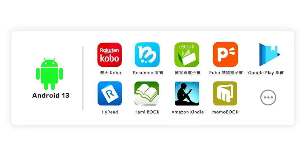 搭載 Android 13 開放式系統,Google Play 商店可安裝多種 Android 應用程式,你想要的筆記、閱讀、聽書,它完全發揮強大的任務處理功能。支援更多的 APP 應用,Kobo、HyRead、博客來、Readmoo、國家圖書館、Hami、Pubu、mybook …等電子書城應用程式。