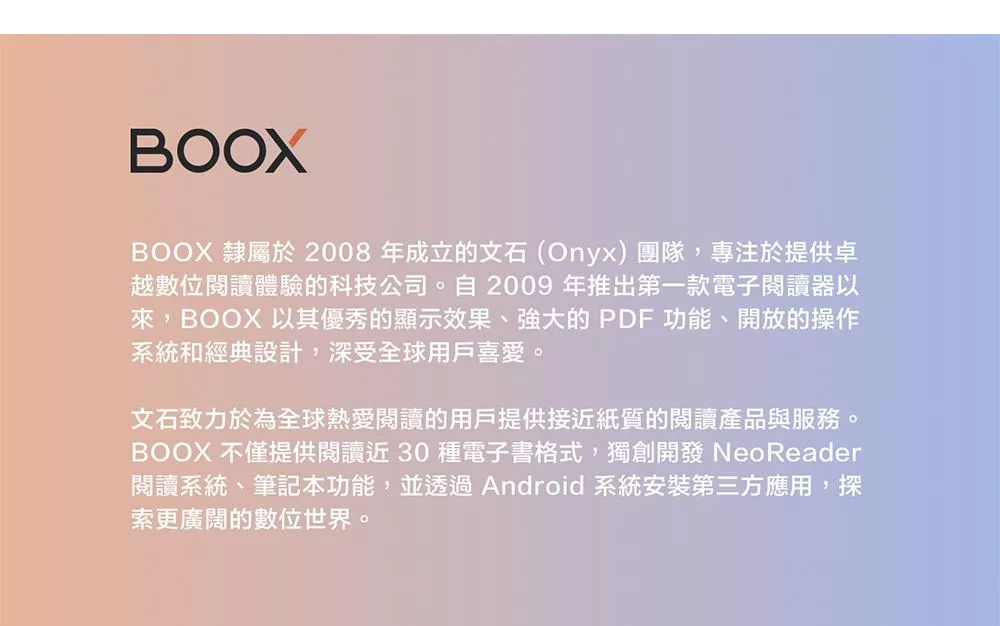 支援多種格式,搭載內建 NeoReader,讓閱讀更具沉浸感。