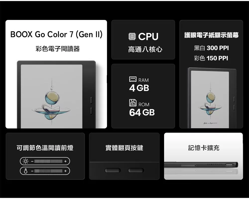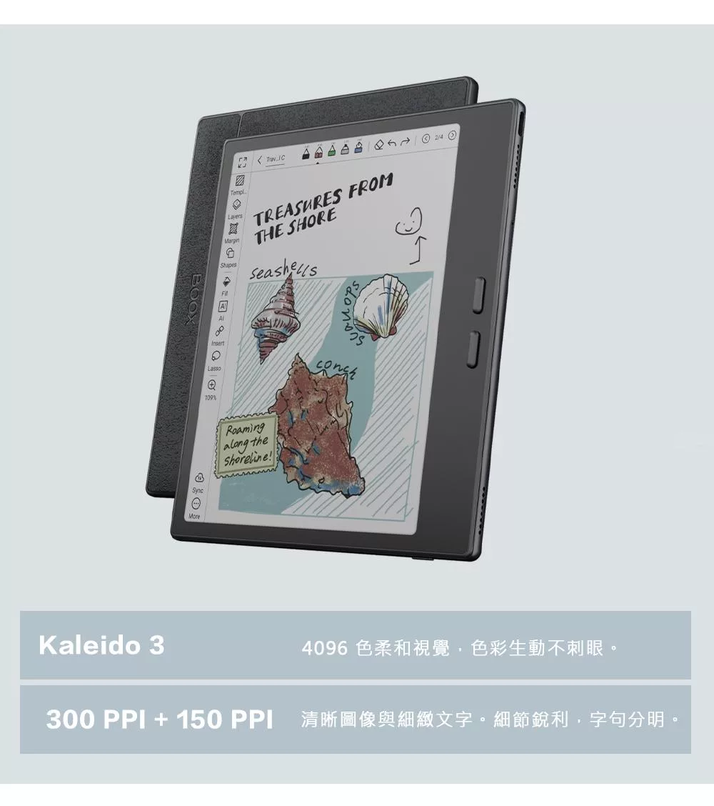 BOOX Go Color 7 (Gen II) 彩色電子閱讀器不僅延續了前代的便攜性與多功能性,還全面升級了視覺與性能表現。搭載最新的 Kaleido 3 彩色電子紙技術,展現出更細膩的色彩層次與柔和的 4096 種色彩,提供 1680 x 1264 (300 PPI) 的黑白解析度與 702 x 936 (150 PPI ) 的彩色解析度,細節栩栩如生。
