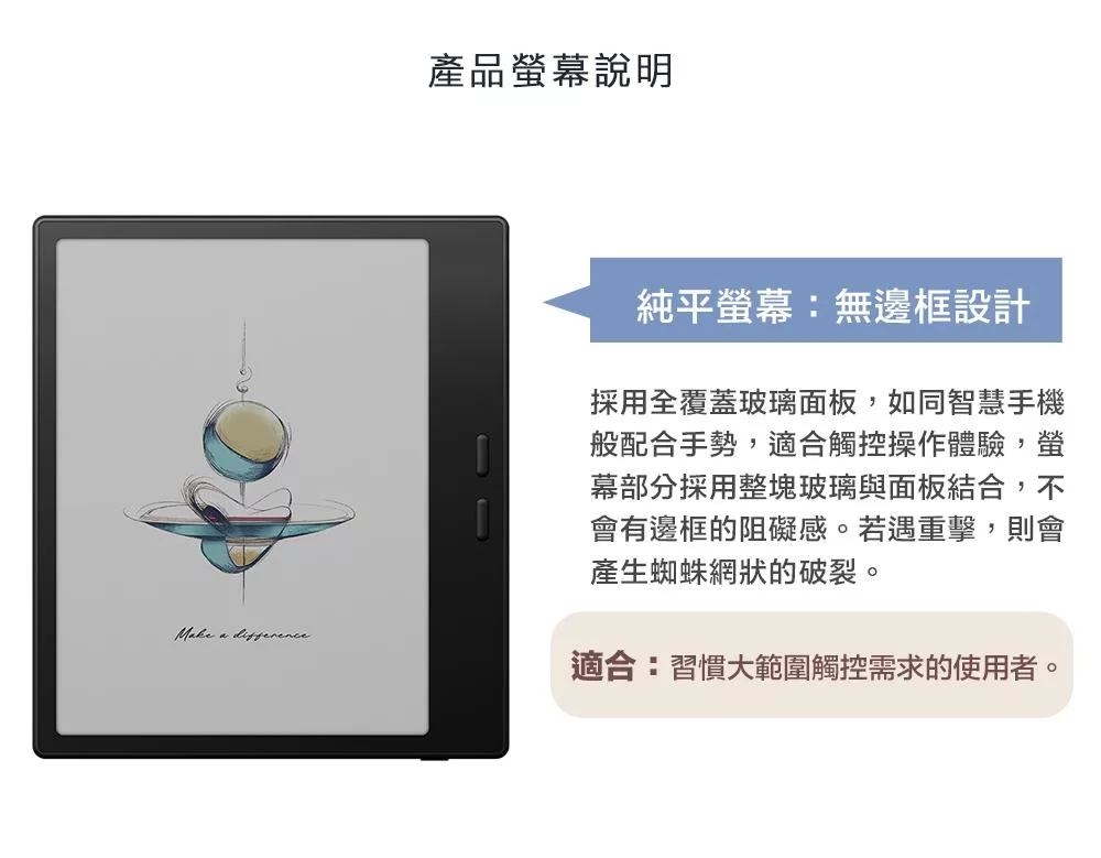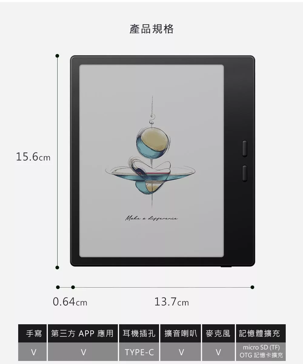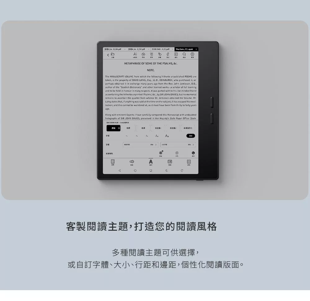 搭載 Carta 1200 技術,在彩色顯示技術、解析度、對比度與系統效能上都有顯著升級,為使用者帶來更細膩的視覺效果、更流暢的操作體驗,以及更廣泛的應用支援,是一款全方位優化的彩色電子紙閱讀器。提供如紙般細膩的閱讀體驗,並支援調節前光 (暖光、深色模式或關閉前光) 以適應不同環境的光線需求。