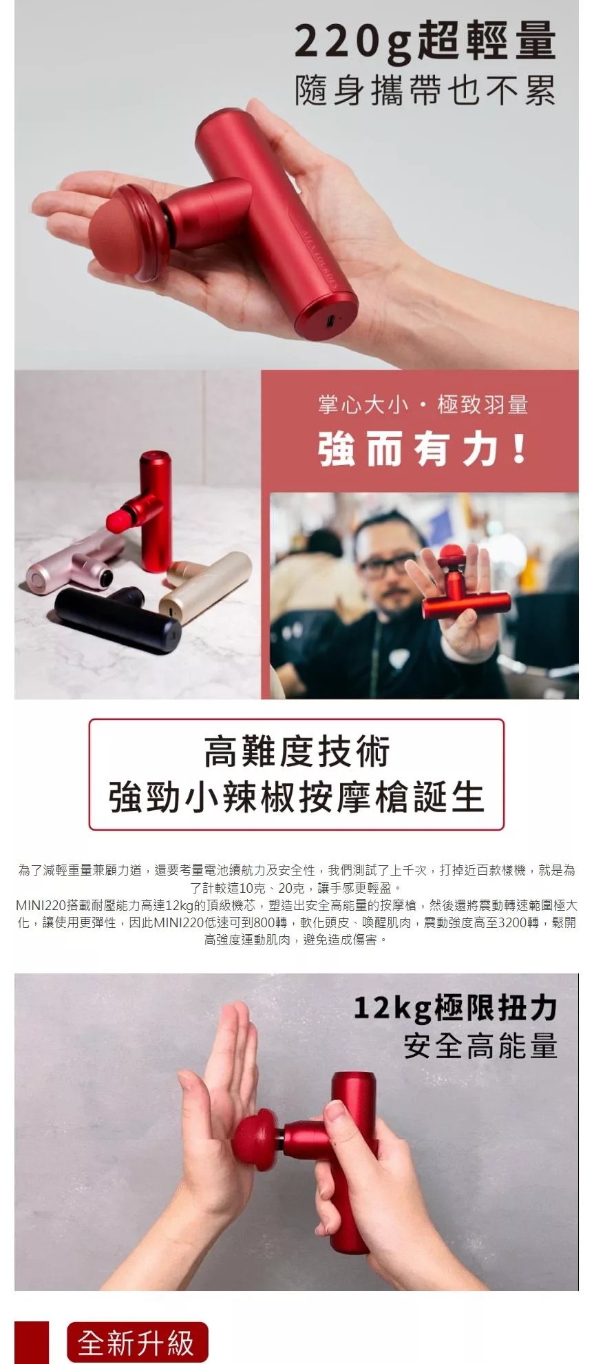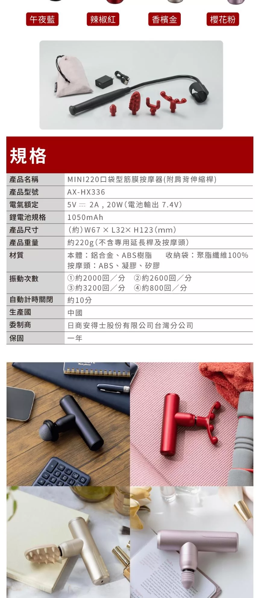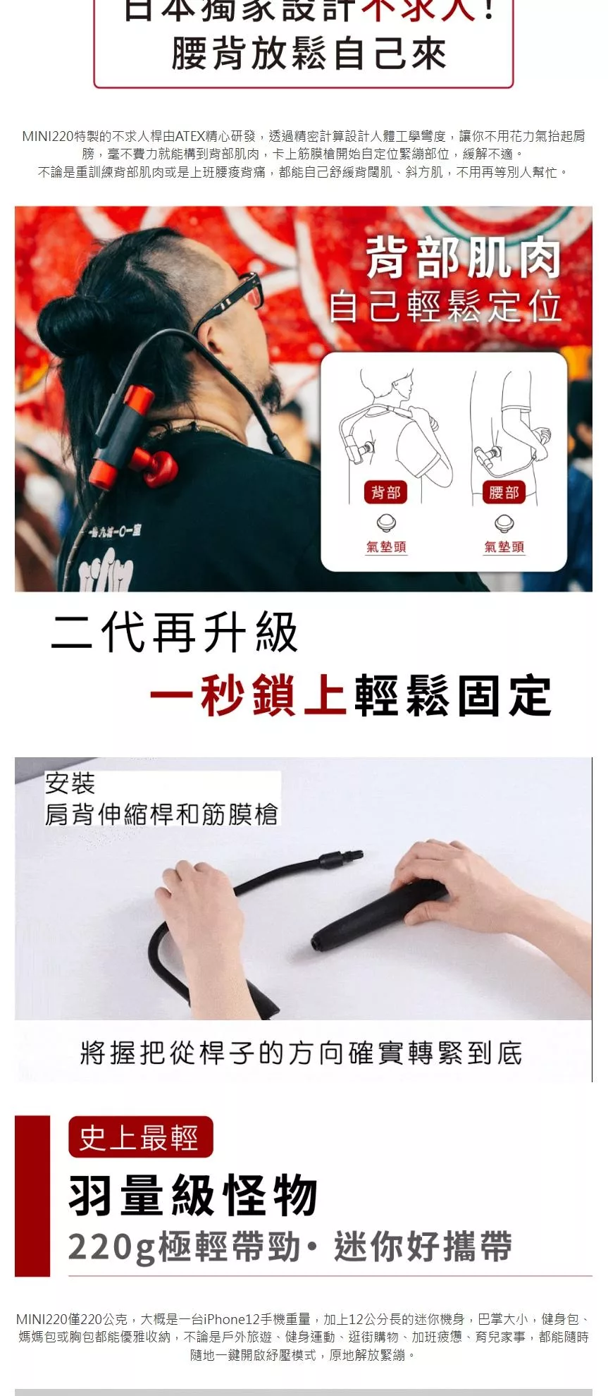 ATEX MINI220口袋型筋膜按摩槍(附肩背伸縮桿) AX-HX336 (四色) /不求人筋膜槍 辣椒紅