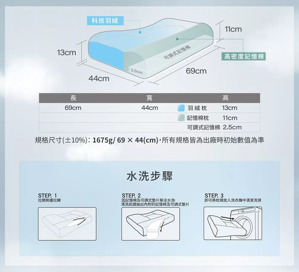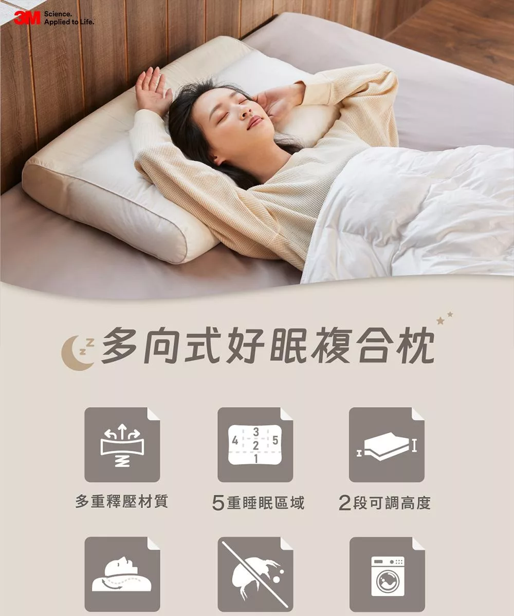 3M 防蹣可水洗科技羽絨枕-可調式多區複合型(多向好睡枕)