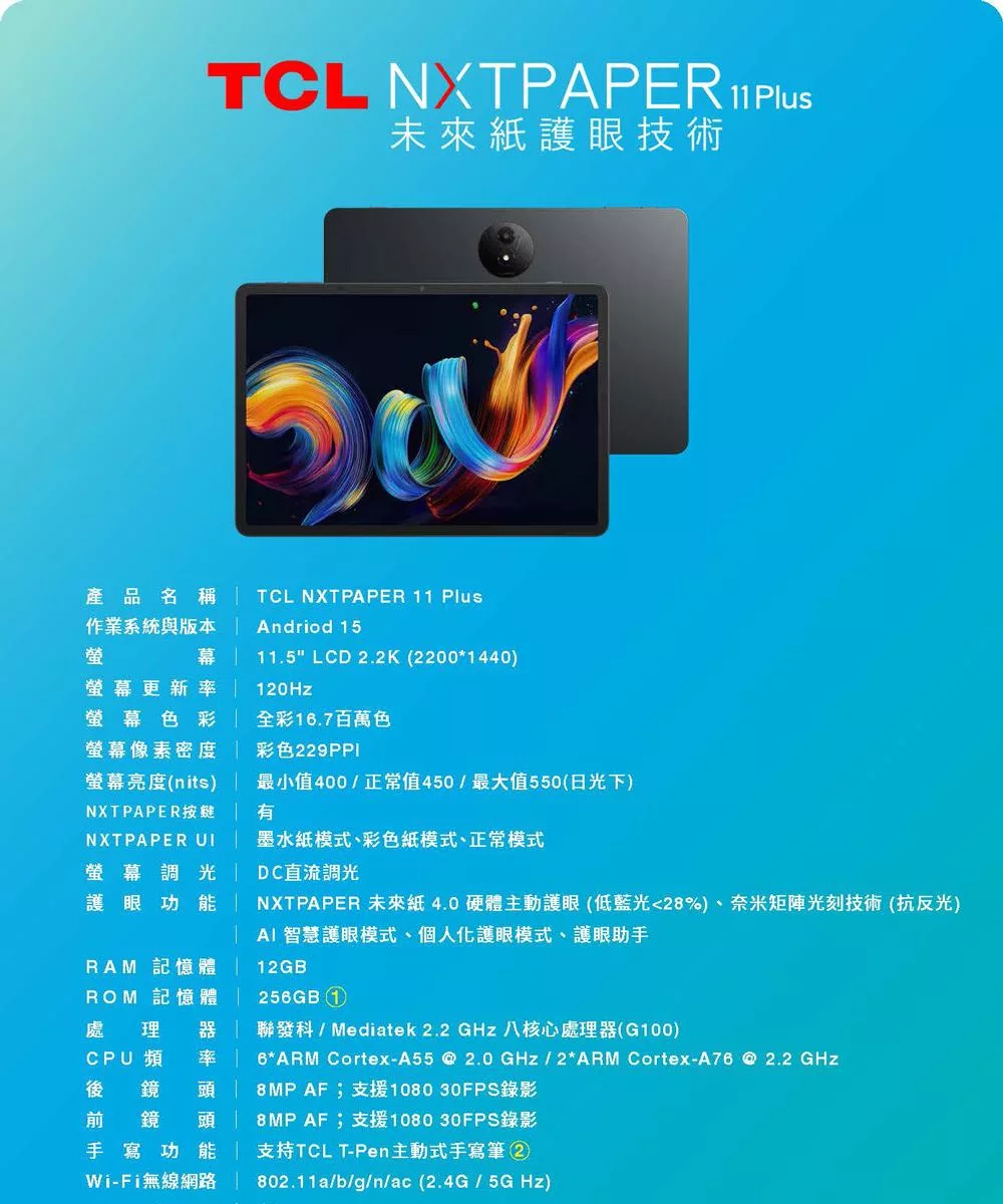 ★贈藍牙鍵盤★TCL NXTPAPER11 PLUS 11吋 12G/256G WiFi 平板電腦