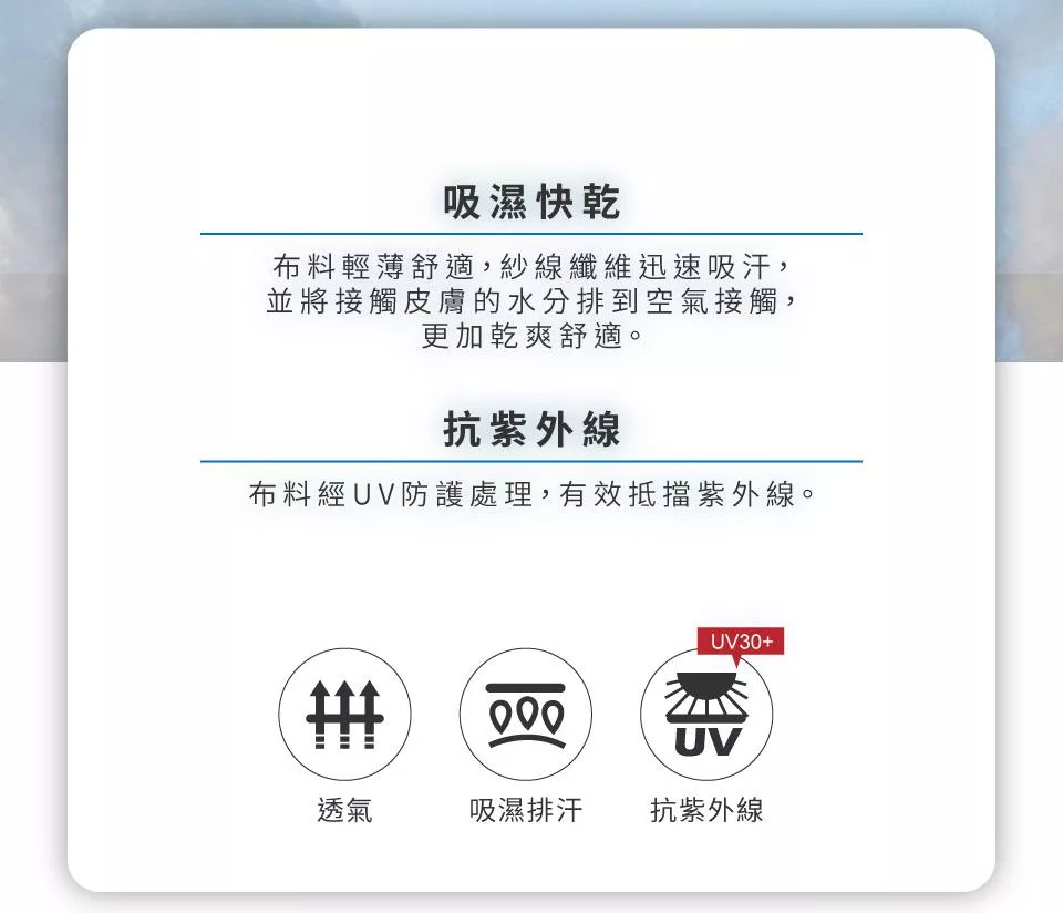 2.排汗衫材質細緻柔軟,因外力產生勾紗或起毛毬,不影響功能,請安心使用。