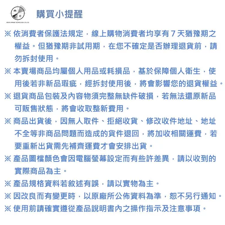 當您於此頁面下單表示您了解並同意下述規範,請注意!