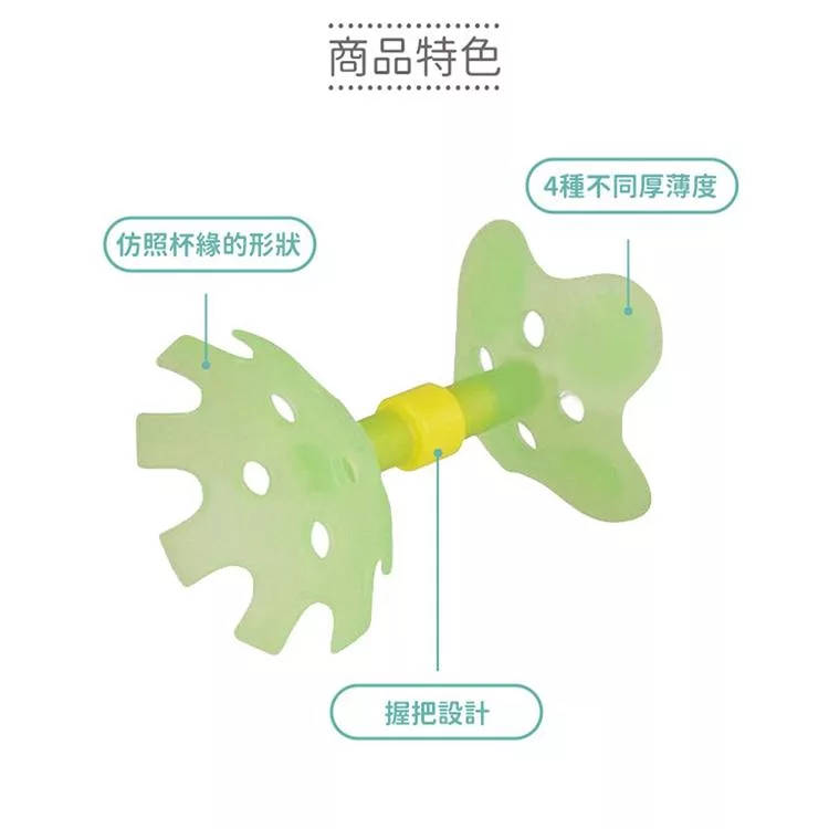 ●為讓寶寶學習用杯子喝水,本產品設計為仿照杯緣的形狀。