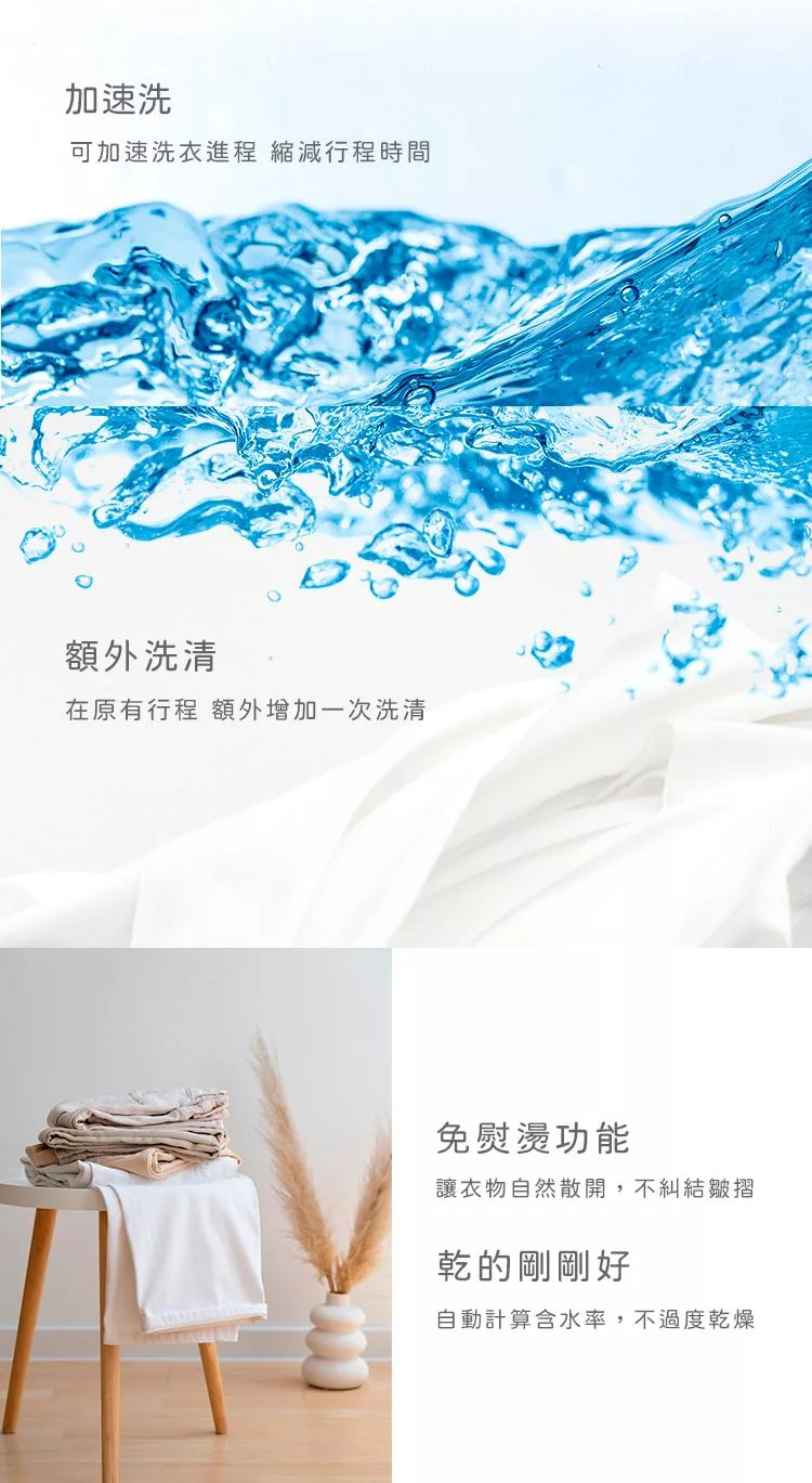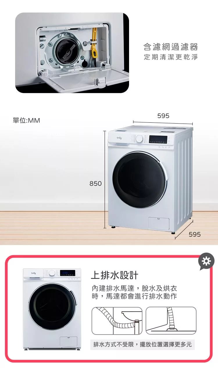 內建排水馬達,脫水及烘衣時,馬達都會進行排水動作。(排水方式不受限,擺放位置選擇更多元)