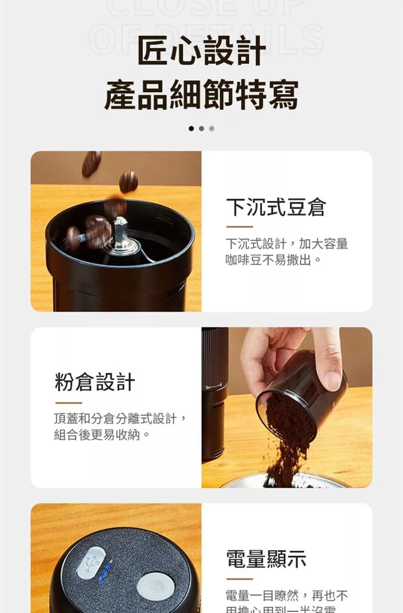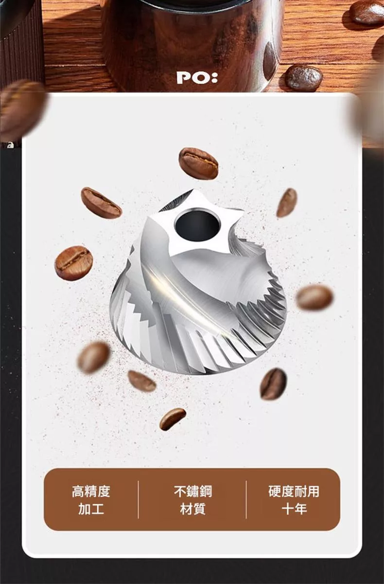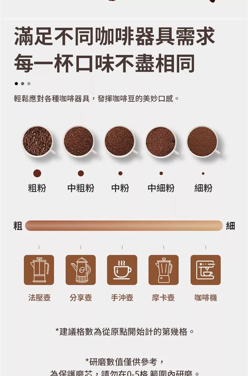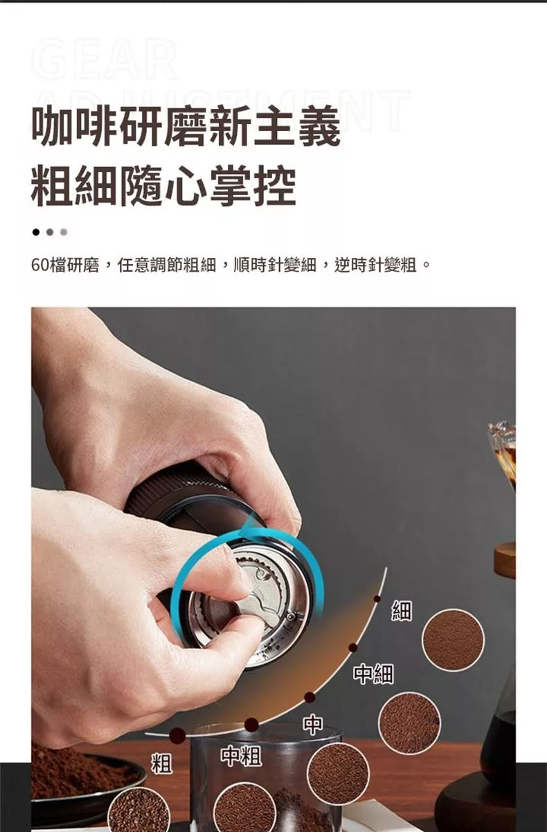 USB充電,免除充電煩惱,耐用不鏽鋼研磨刀盤,研磨效果卓越,多達60段可調研磨粗細,打造完美咖啡
