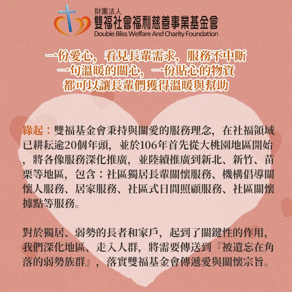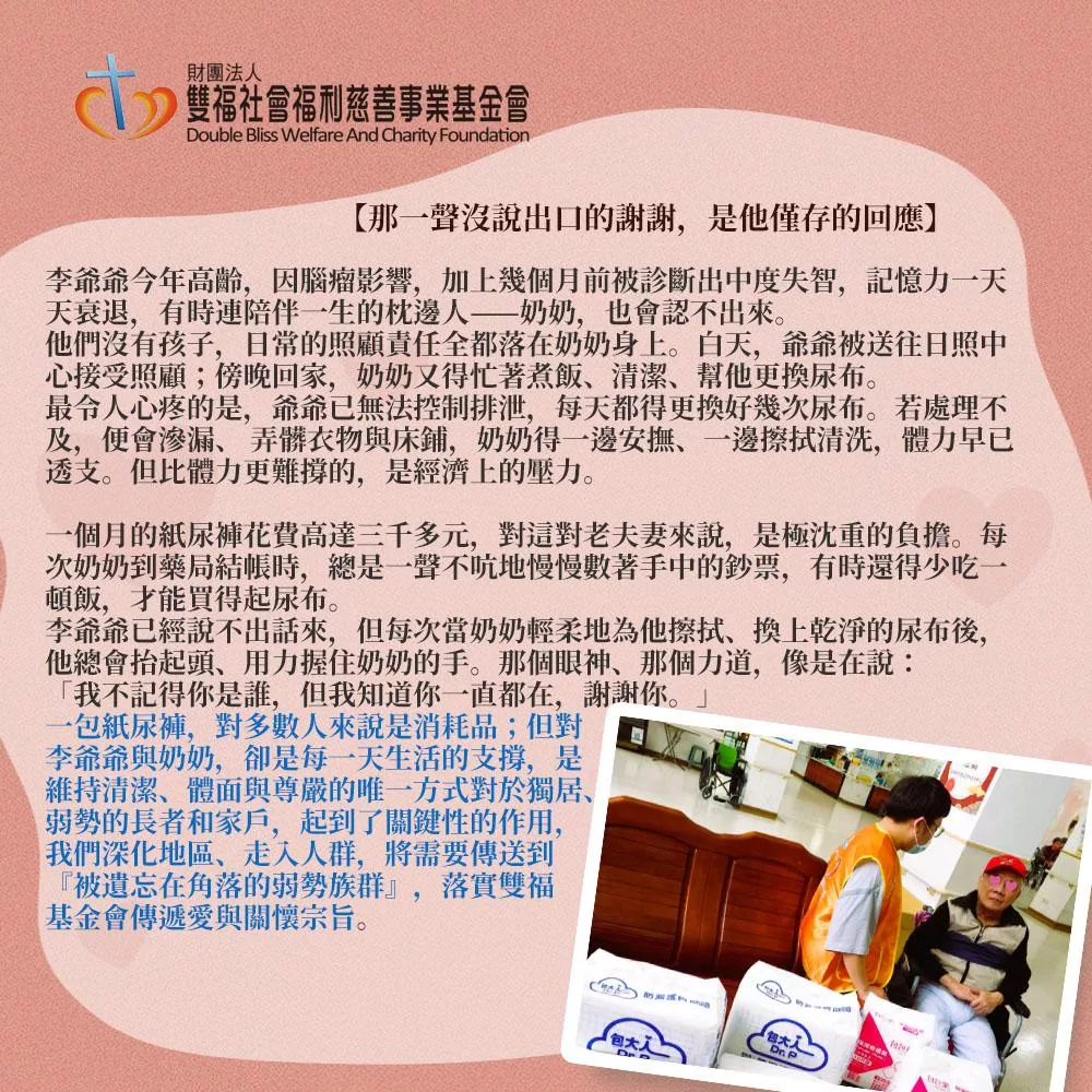 雙福基金會/公益/送愛/愛心/助人/溫暖/希望/感動/失能/失禁/尿褲/尿布/護墊/復健褲