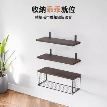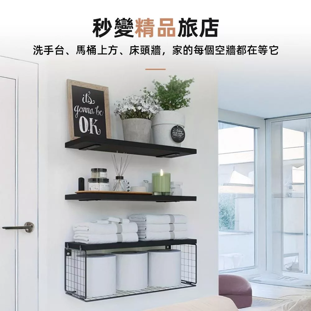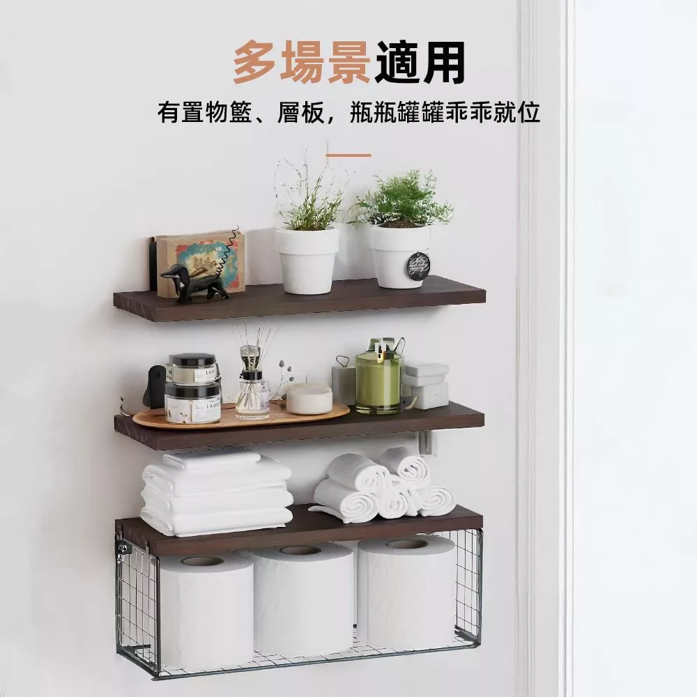 這組三件式層板架,設計師級搭配,輕鬆打造精品旅店感。兩層木質層板可擺放香氛、植栽、保養瓶罐,下方網籃則適合收納衛生紙、毛巾等大件備品,結合收納與裝飾功能,洗手台、馬桶上方、甚至床頭牆都能妥善利用,讓每一面牆都發揮價值。