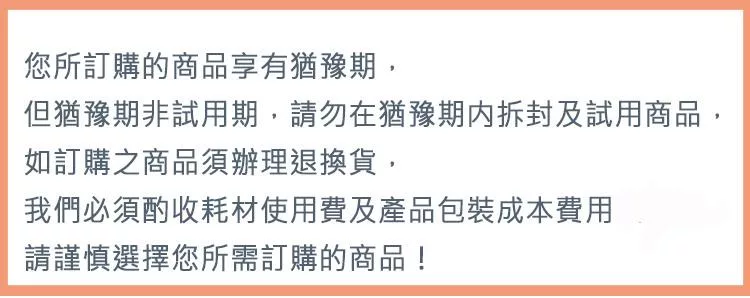 非屬上列品項之商品均享有到貨十天的猶豫期(含例假日)。退回之商品必須於猶豫期內寄回。