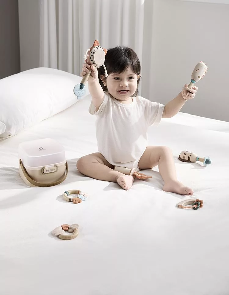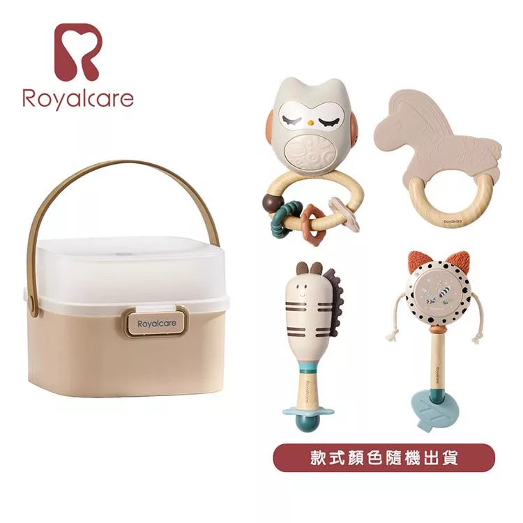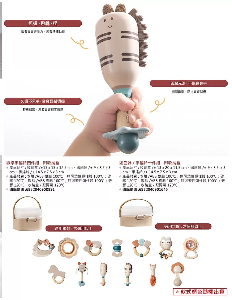 產品尺寸:收納盒 ±15x15x12.5cm;固齒器 ±9x8.5x3cm;手搖鈴 ±14.5x7.5x3cm