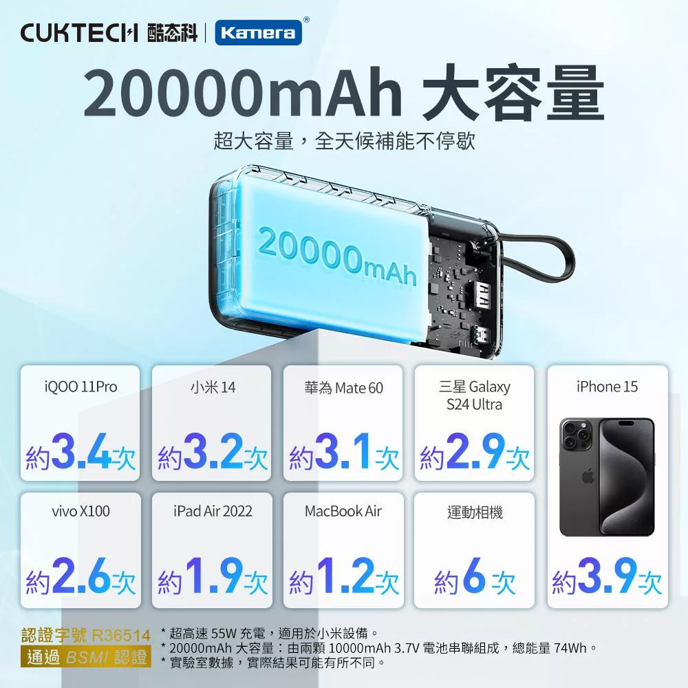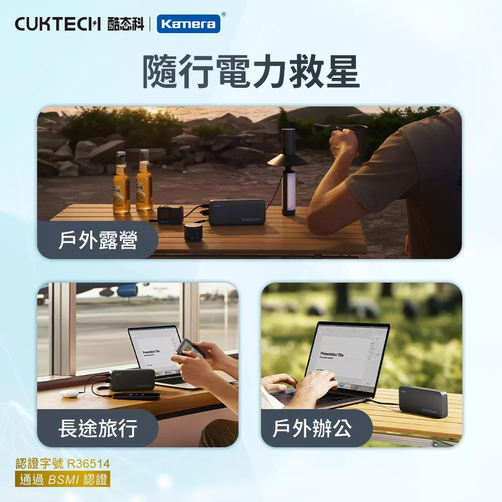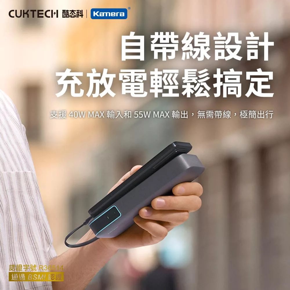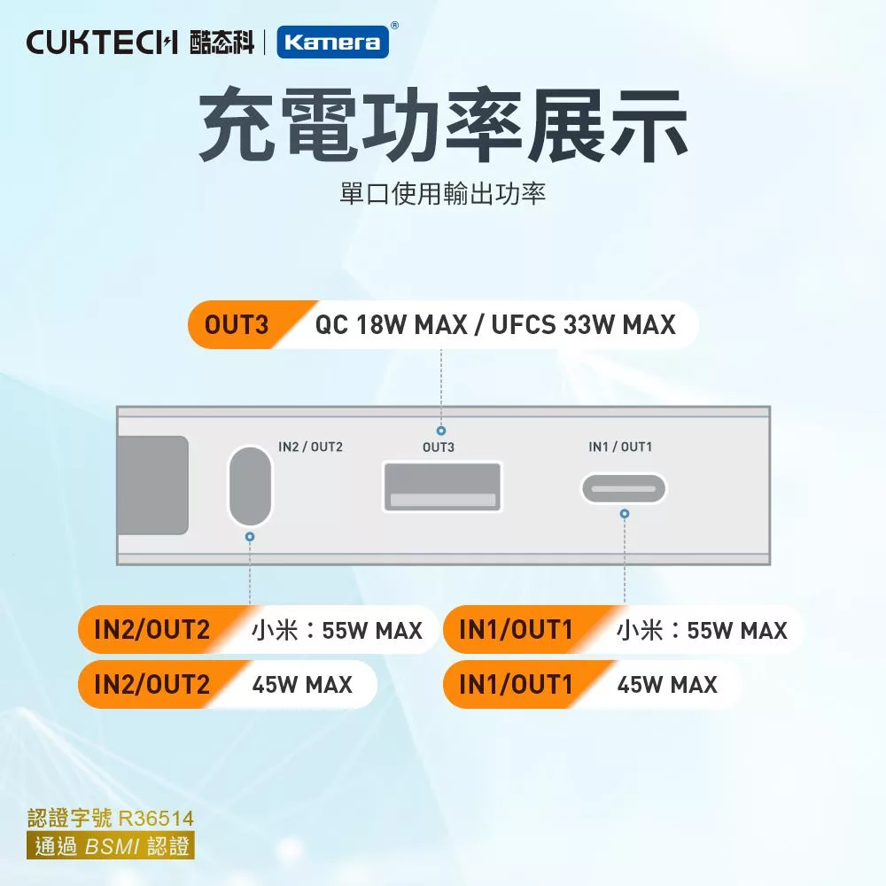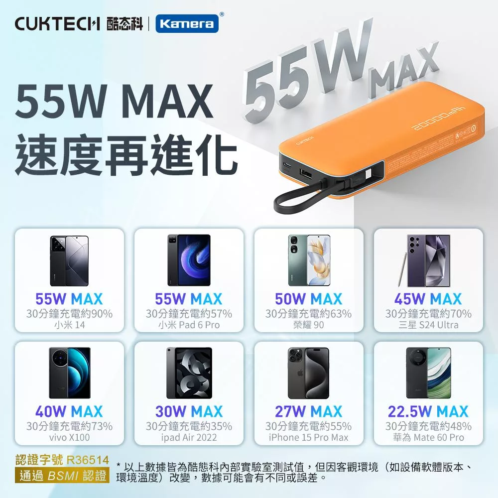 2. 55W高效快充,筆電也能補電:支援最高55W PD快充,可為筆電丶iPad丶Switch等設備快速充電。相較常見20W/30W行動電源,效能大升級。