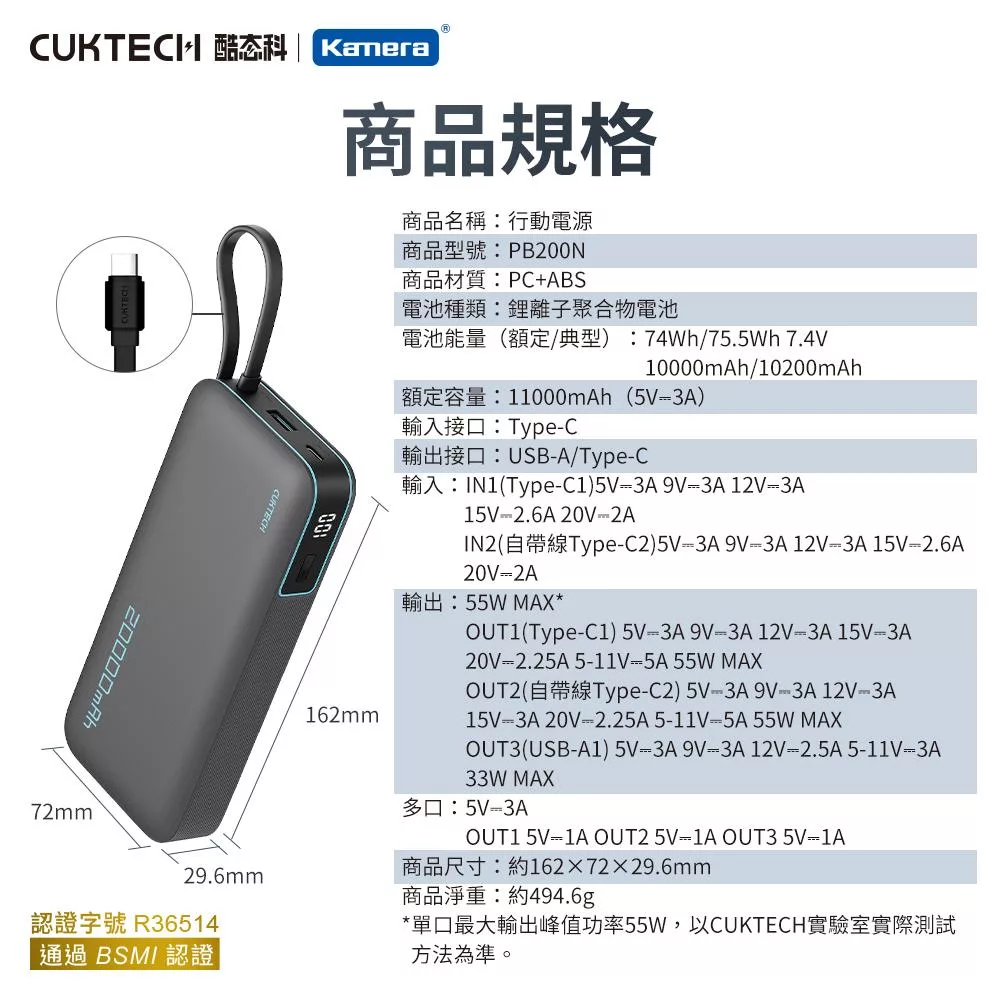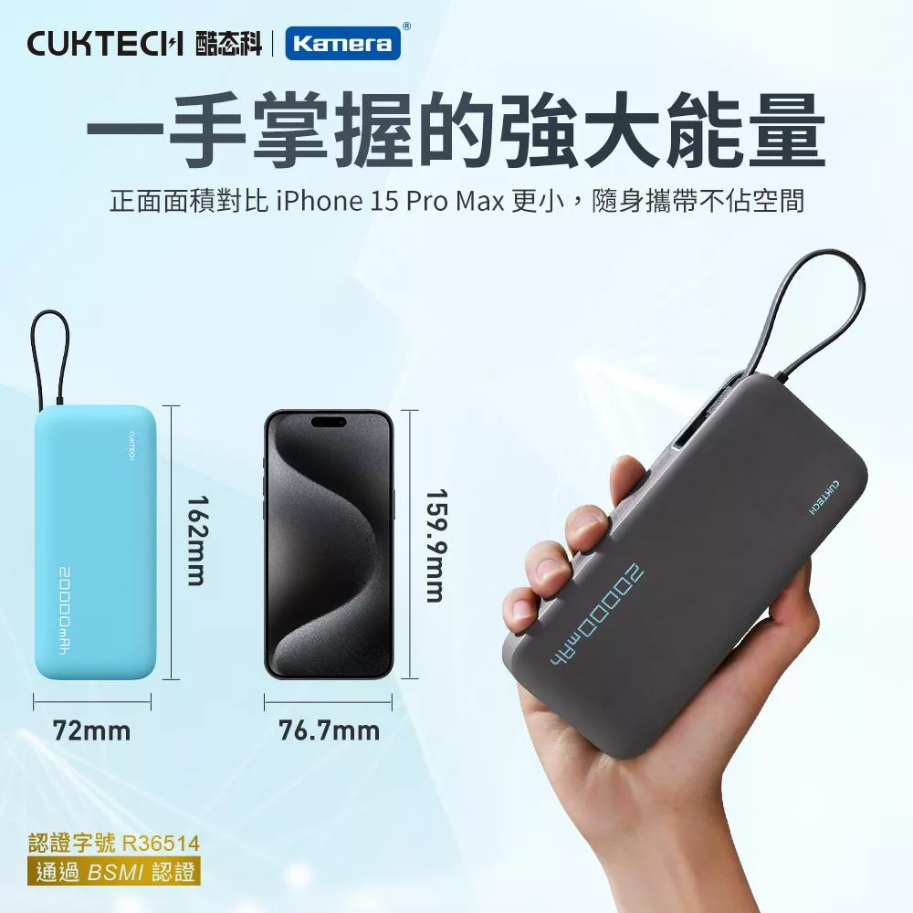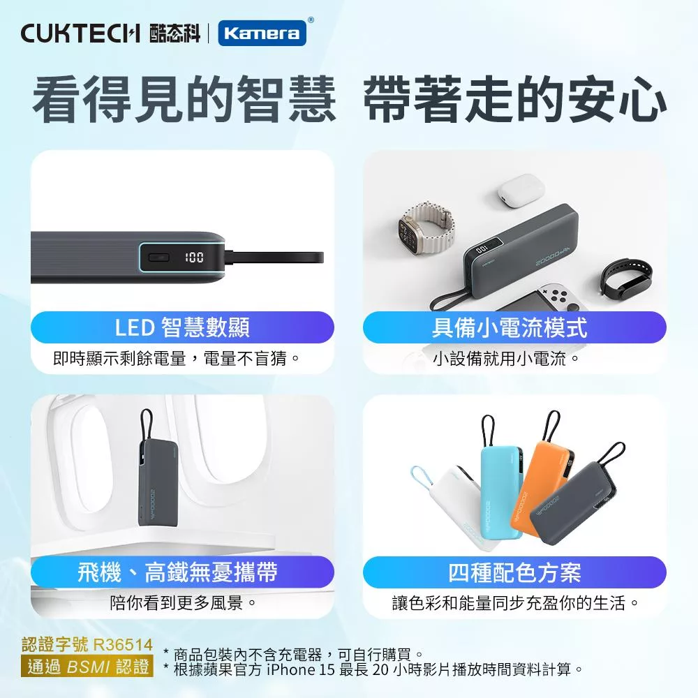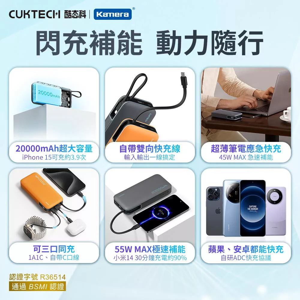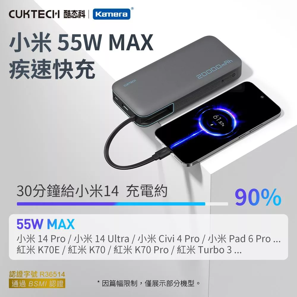 2. 55W高效快充,筆電也能補電:支援最高55W PD快充,可為筆電丶iPad丶Switch等設備快速充電。相較常見20W/30W行動電源,效能大升級。