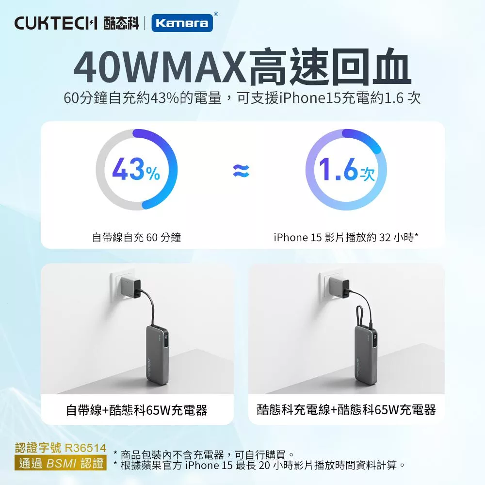 4. 40W MAX高速回血:搭配65W以上充電器,60分鐘自充約43%電量,可支援iPhone 15充電約1.6次。