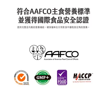 符合AAFCO每日主食營養標準,並獲得國際食品安全認證
