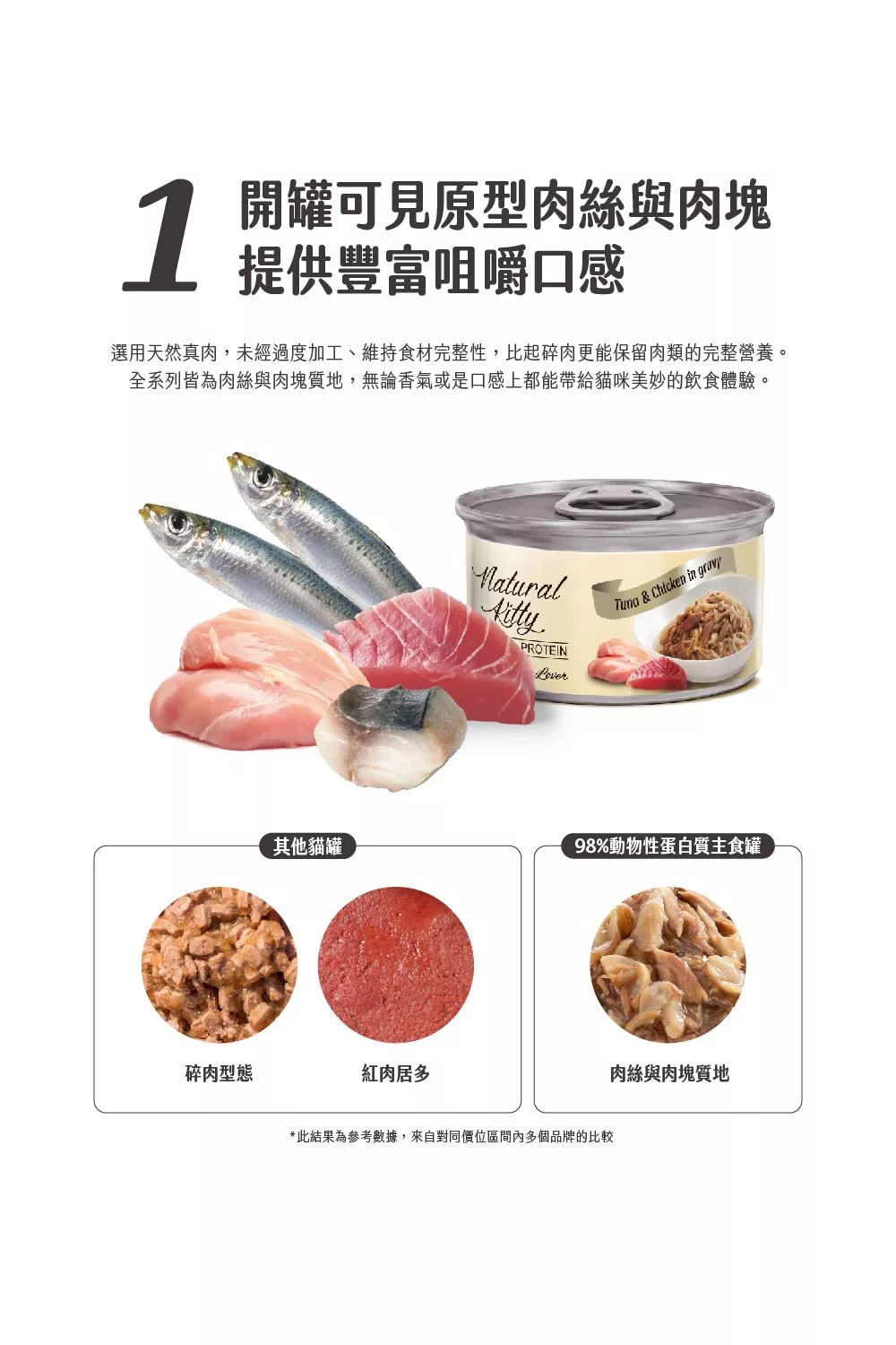 98%動物性蛋白質,開罐可見原型肉絲與肉塊,提供豐富咀嚼口感。