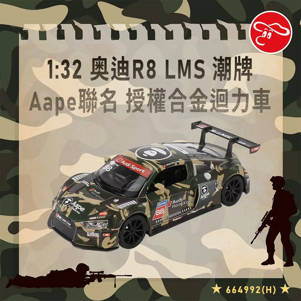 產品名稱:1:32 奥迪R8 LMS+潮牌Aape聯名 授權合金迴力車 黑金色