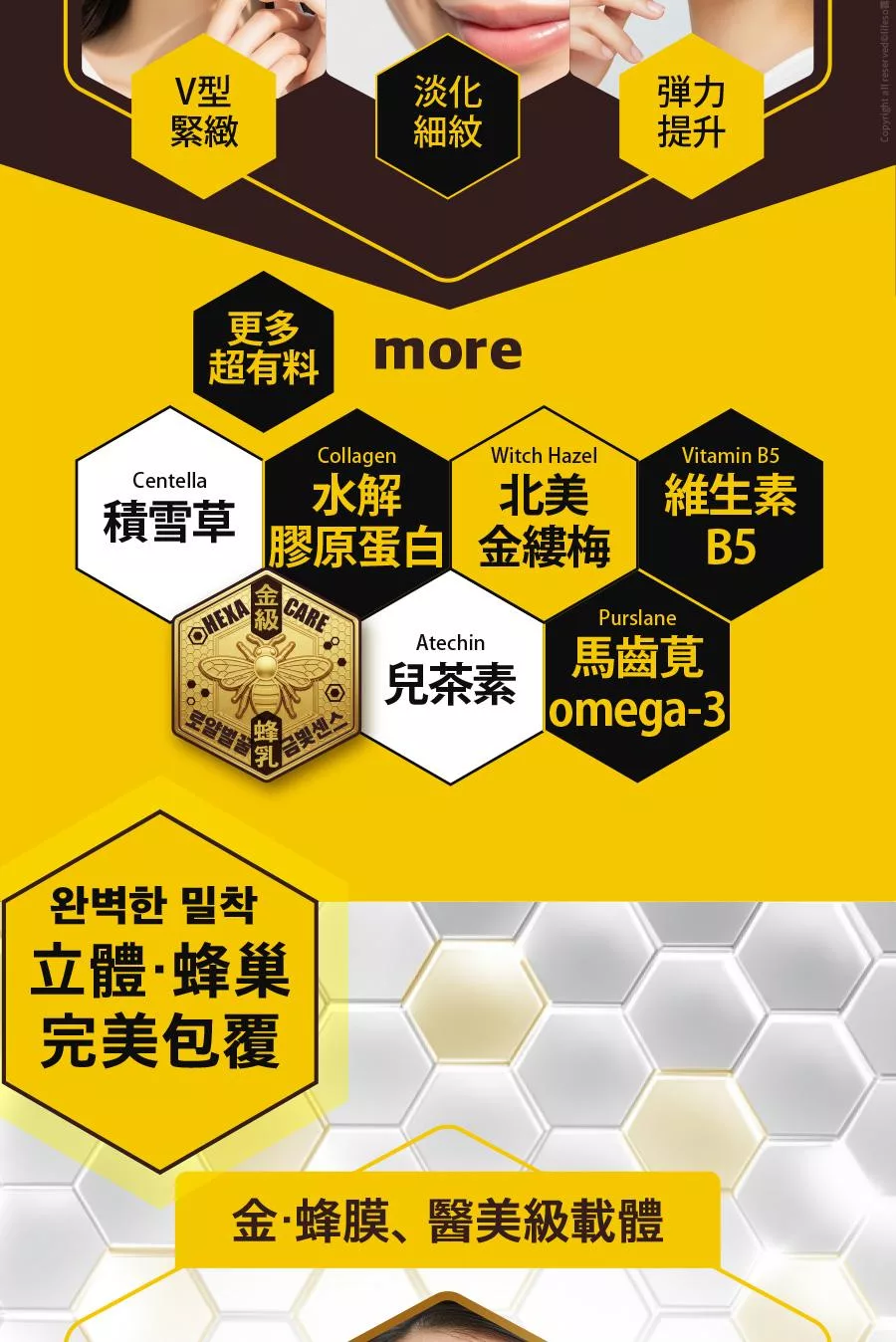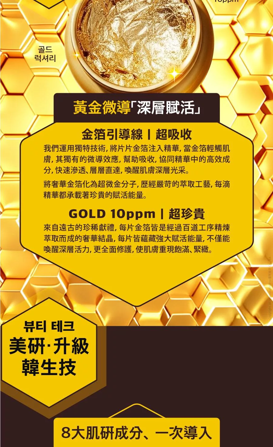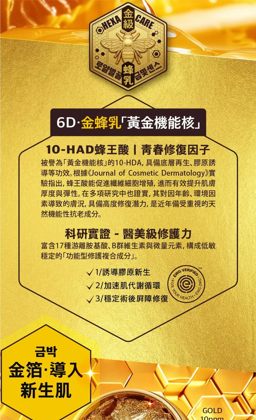 成份:金蜂王乳、金箔、玻尿酸、β葡聚醣、六胜肽、積雪草、維生素B5...等,詳細請見外包裝英文全成份列表。