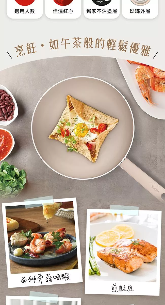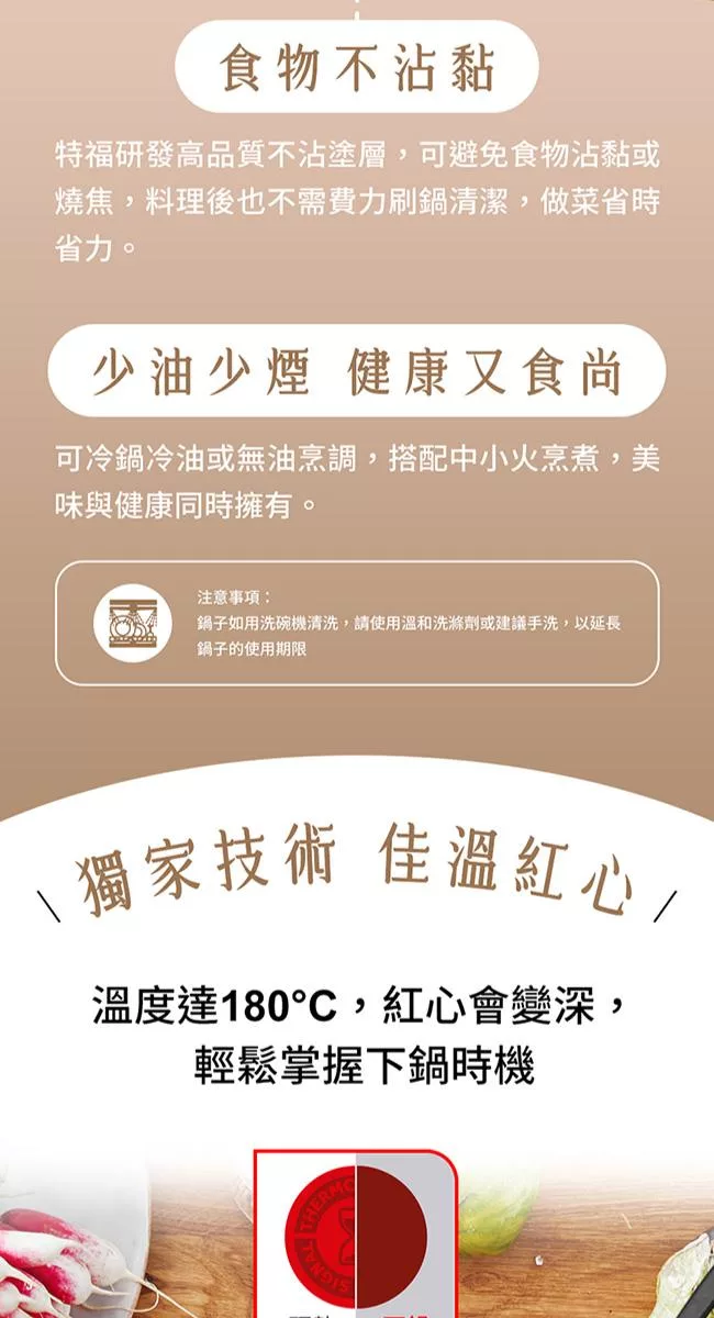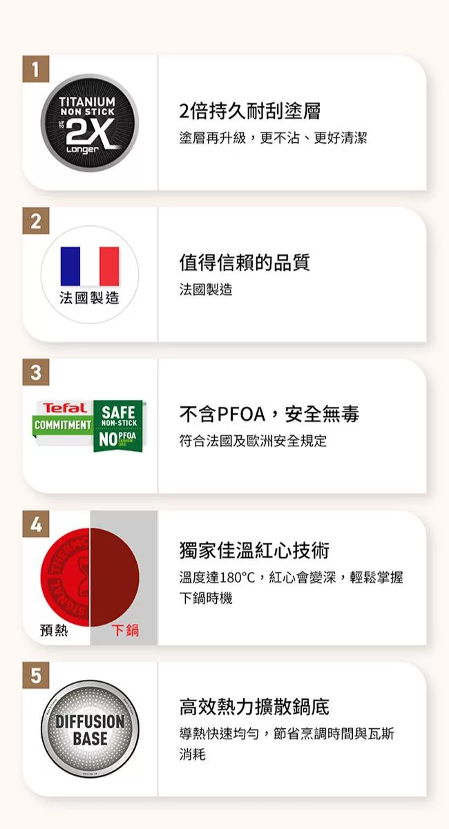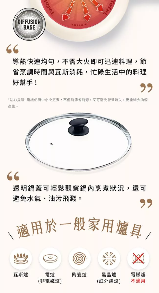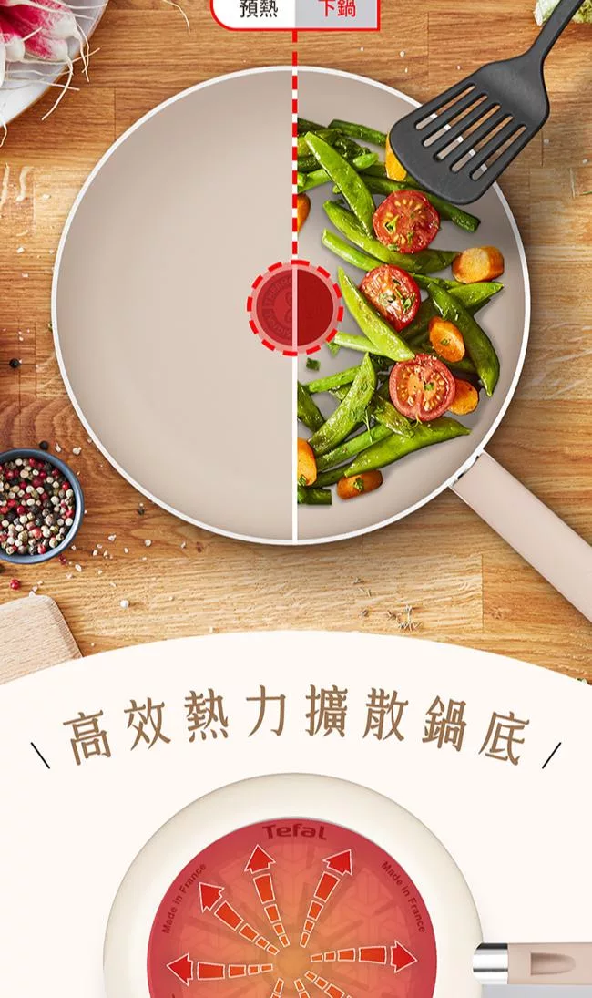 4.特福不沾鍋因鍋底設計具有高傳熱功能,建議用中小火烹調即可,節省能源又可避免營養流失,更能減少油煙的產生。