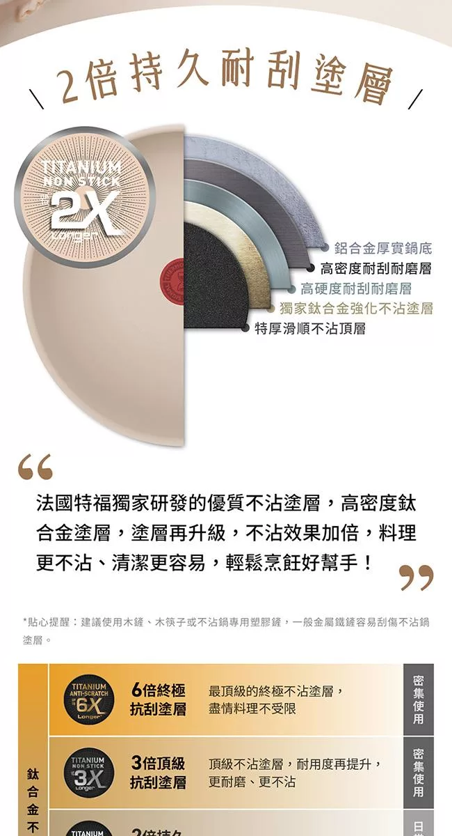 特福獨家研發的Titanium 2X 不沾塗層配方,添加鈦合金微粒子,極強效抗磨耐刮,不沾效果佳又好清洗!