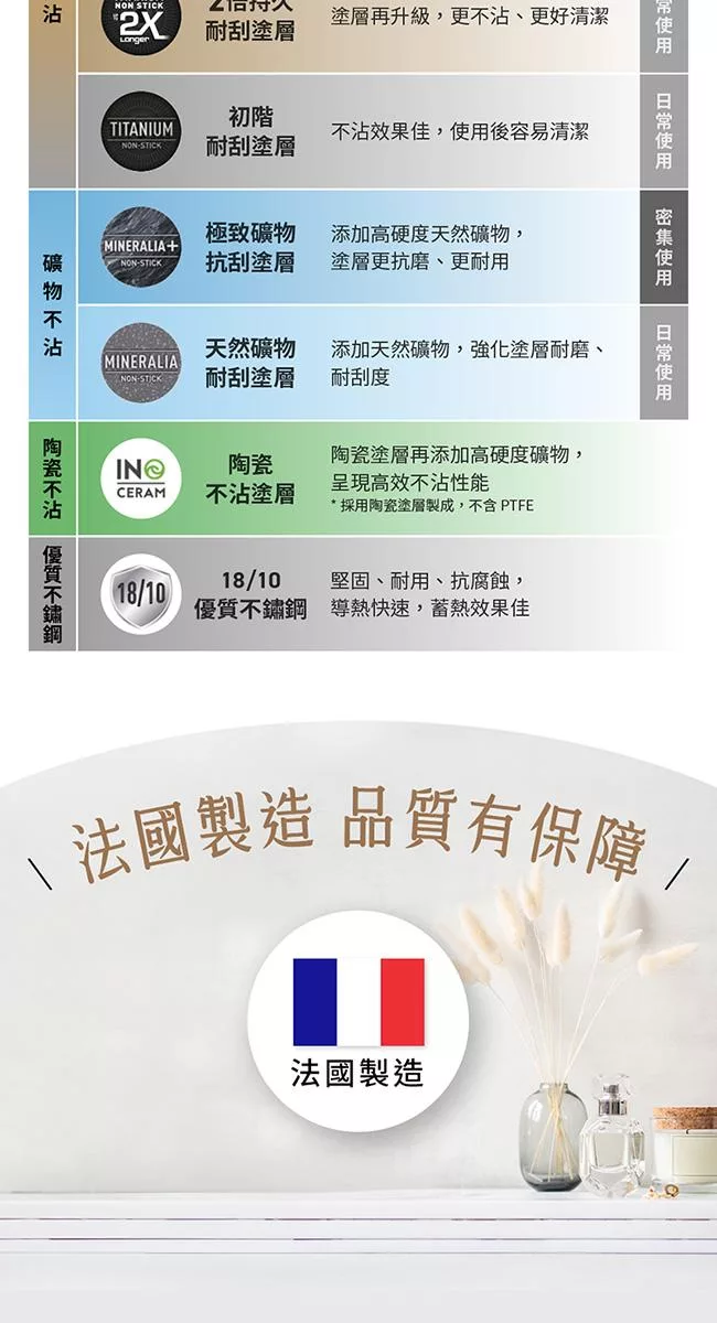 法國製造品質有保障,鍋具不含PFOA、鉛與鎘,通過歐盟安全規範,無毒更安心。