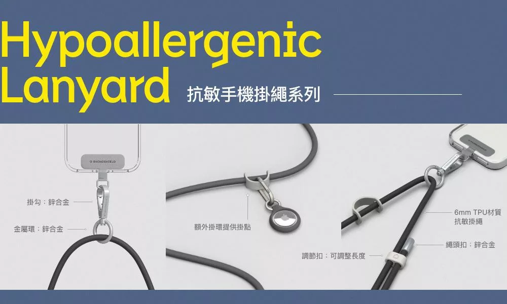 A:犀牛盾抗敏手腕掛繩通過SGS皮膚過敏測試以及致敏測試,檢驗並無產生任何刺激皮膚反應。