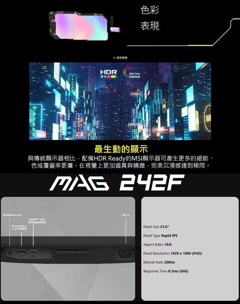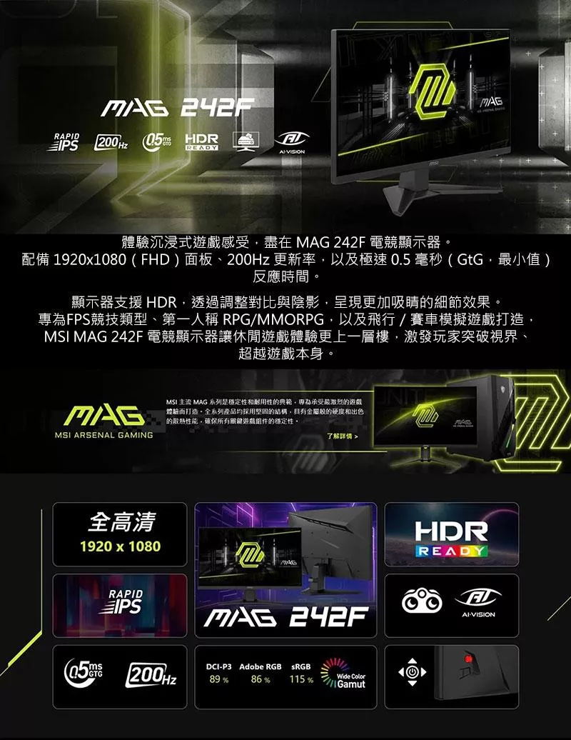 msi微星 MAG 242F 23.8吋 平面電競螢幕 (23.8"/1920x1080/16:9/200Hz/IPS)