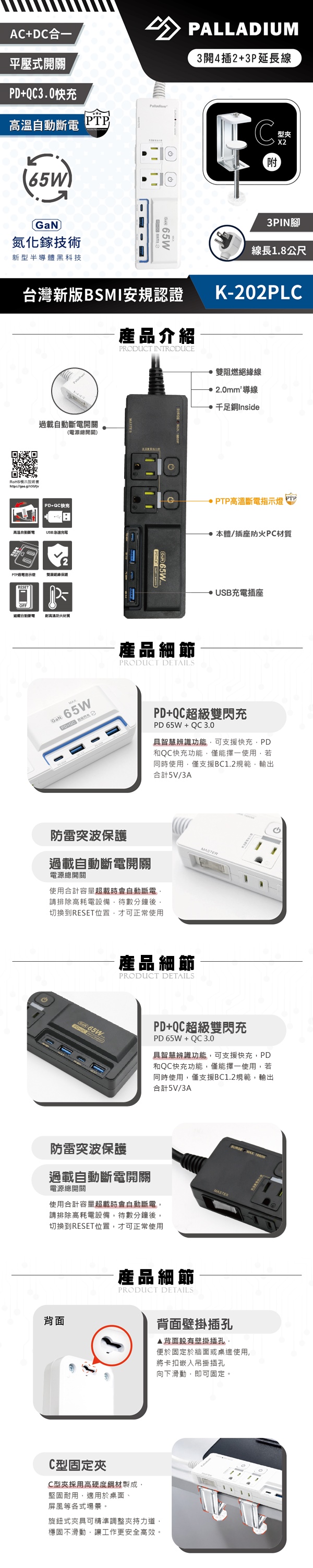 Palladium帕拉丁【附夾具版】3開4插3P 65W 氮化鎵USB超級閃充延長線 K-202PLC