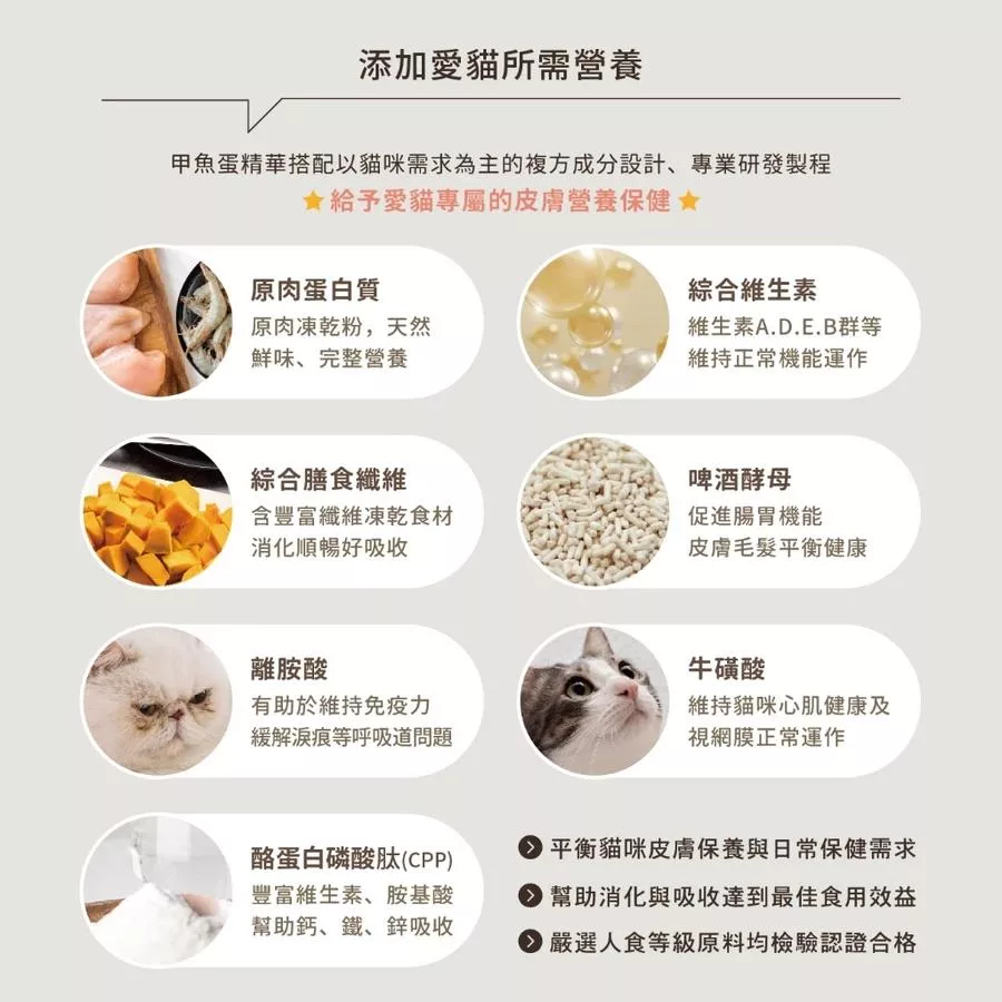 成分:甲魚蛋萃取物、土雞肉、甲魚肉萃取物、扇貝、綜合維生素、綜合膳食纖維、啤酒酵母、離胺酸、牛磺酸、酪蛋白磷酸胜肽