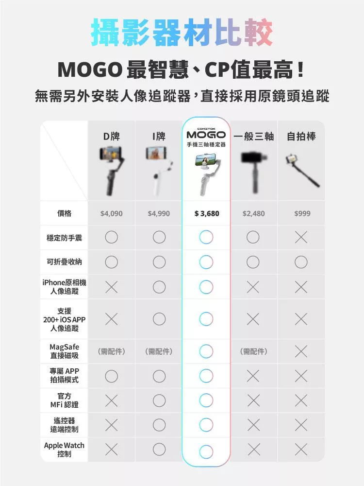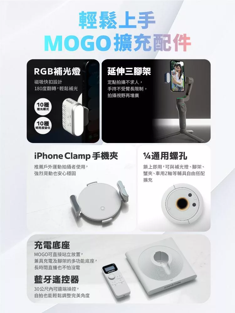 商品"不"包含手機及其他加購品,此賣場僅有MOGO AI手機三軸、三腳架(簡配方案)