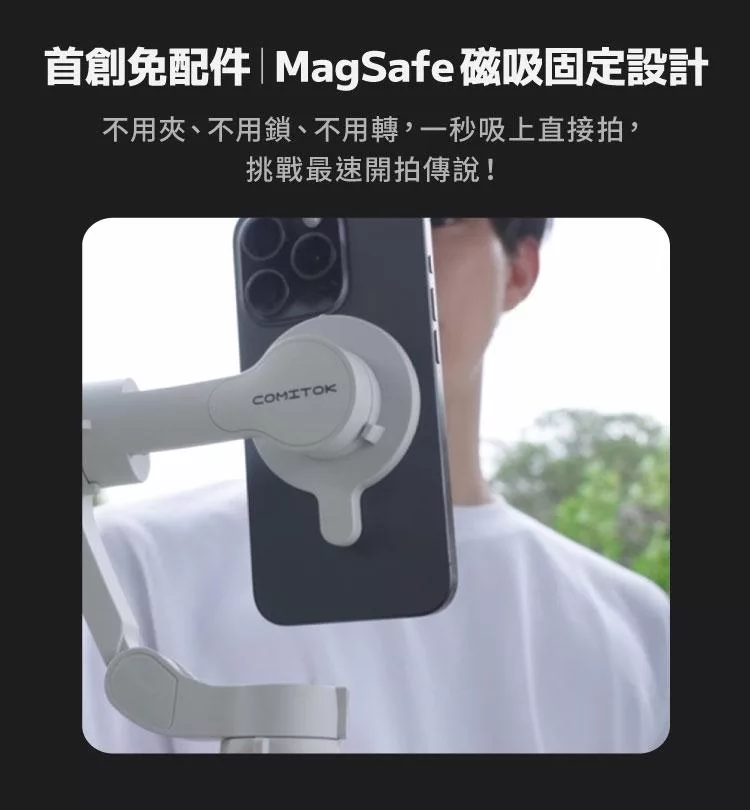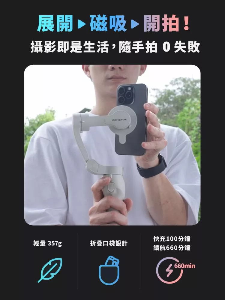 ・輕量357g,折疊收納設計,隨帶隨拍:展開,磁吸,開拍!