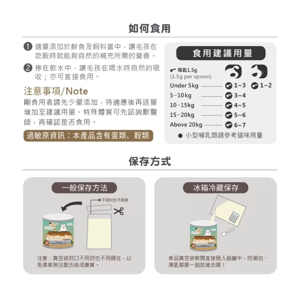 食用方式:開封即食,依照建議用量添加於毛孩鮮食或飼料上,也可直接食用。