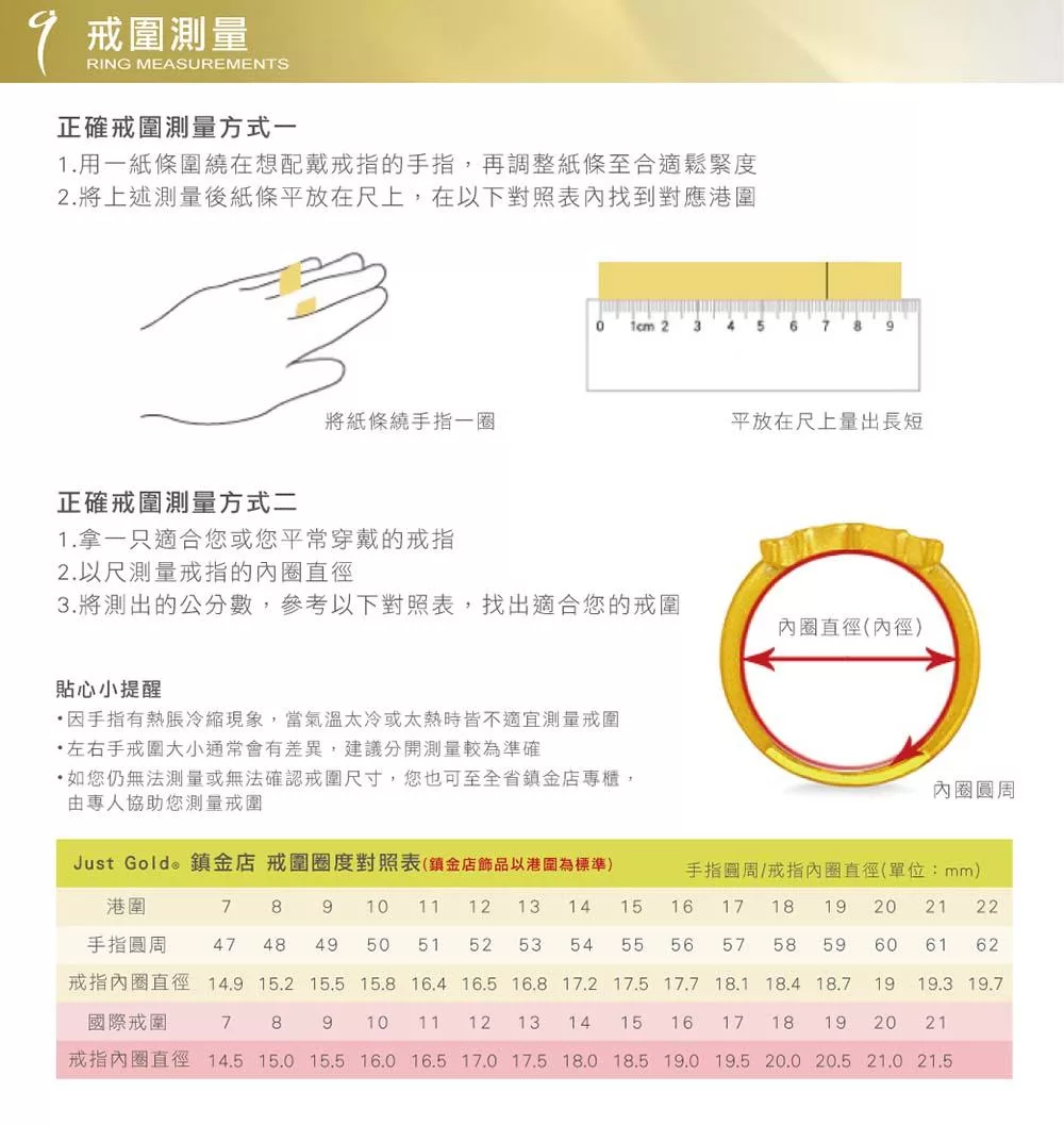【Just Gold 鎮金店】竹耀 可調式 黃金戒指 港圍 13 金色