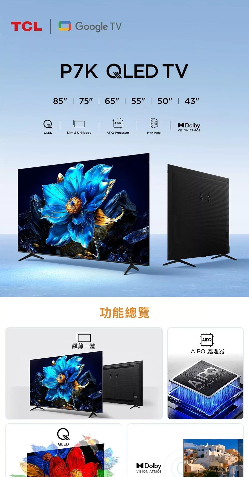 【活動優惠】TCL 85吋 85P7K QLED 量子智能連網液晶顯示器 P7K Google TV 含基本安裝+舊機回收