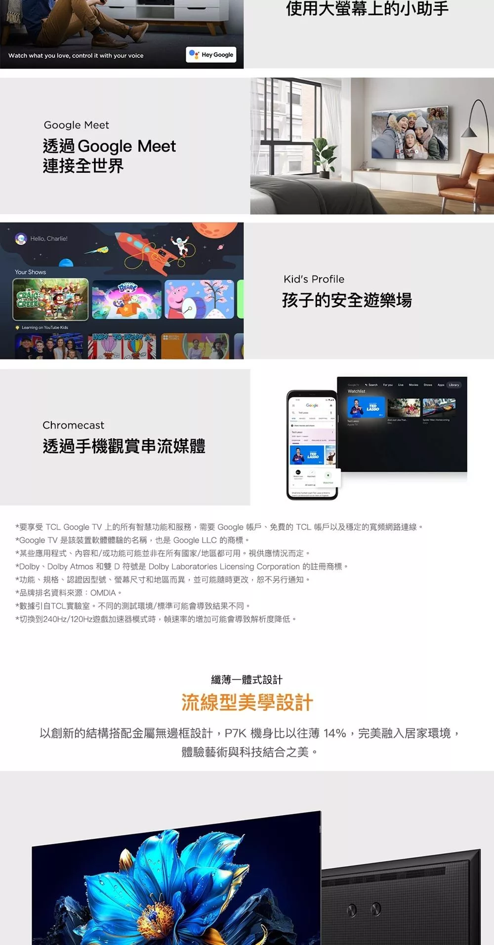 【活動優惠】TCL 65吋 65P7K QLED 量子智能連網液晶顯示器 P7K Google TV 含基本安裝+舊機回收