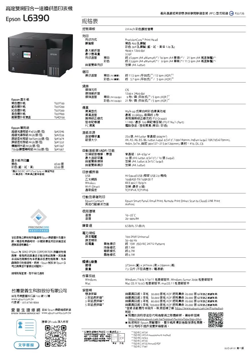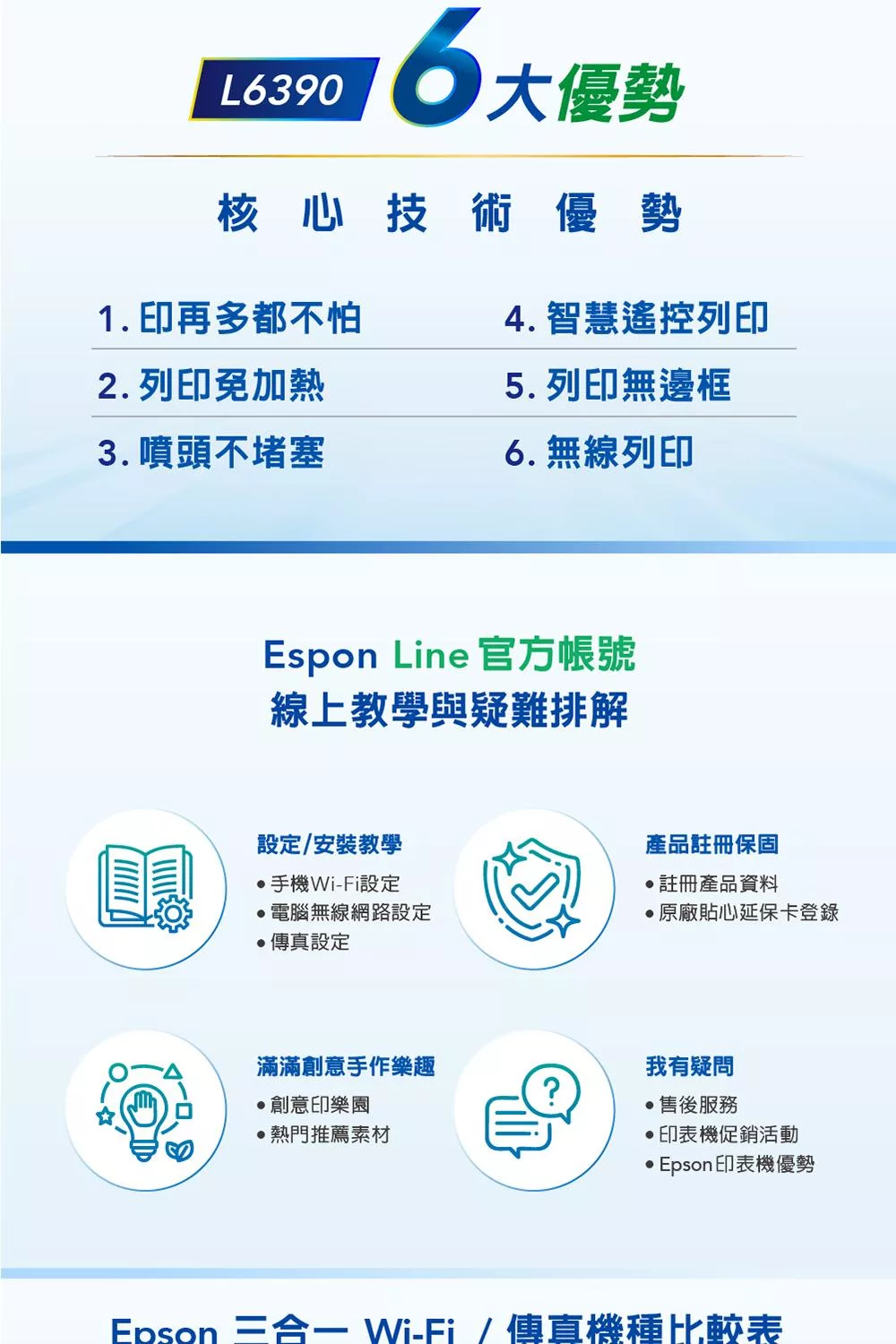 EPSON L6390 高速雙網傳真 智慧遙控連續供墨印表機+T03Y100~400四色墨水二組