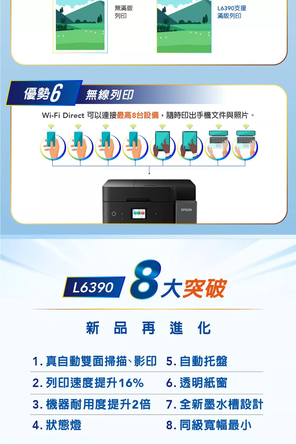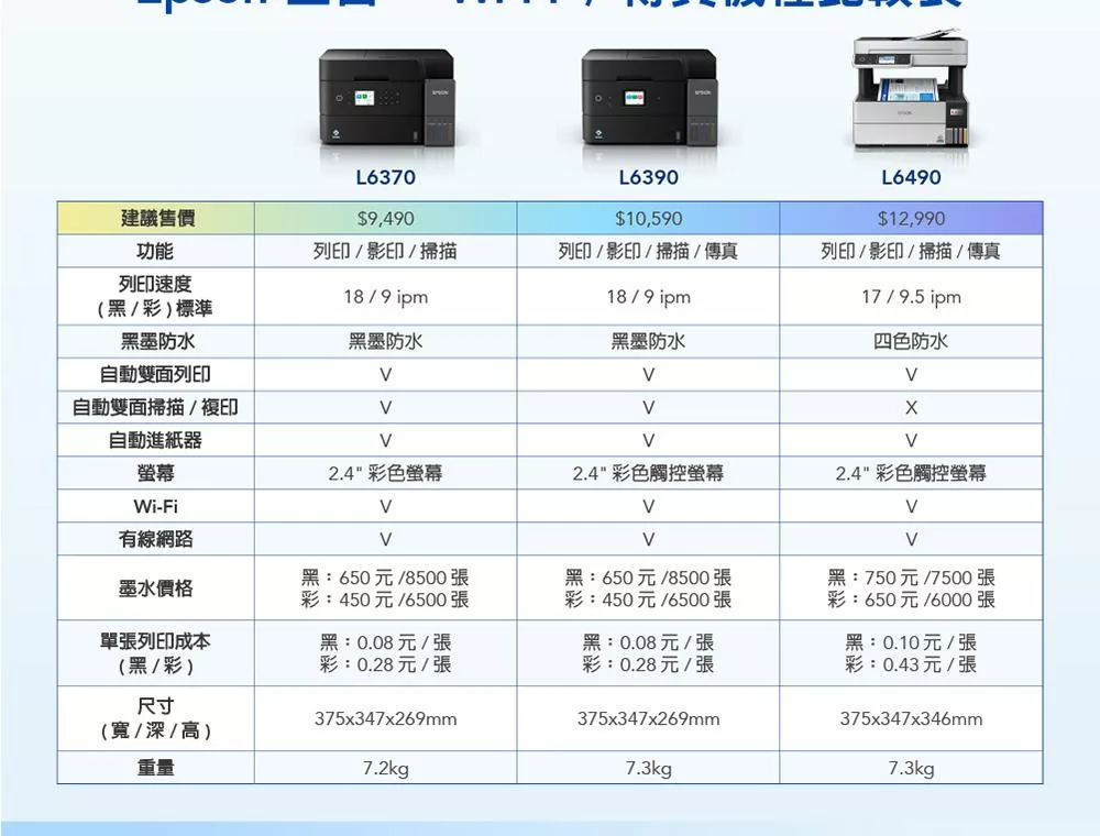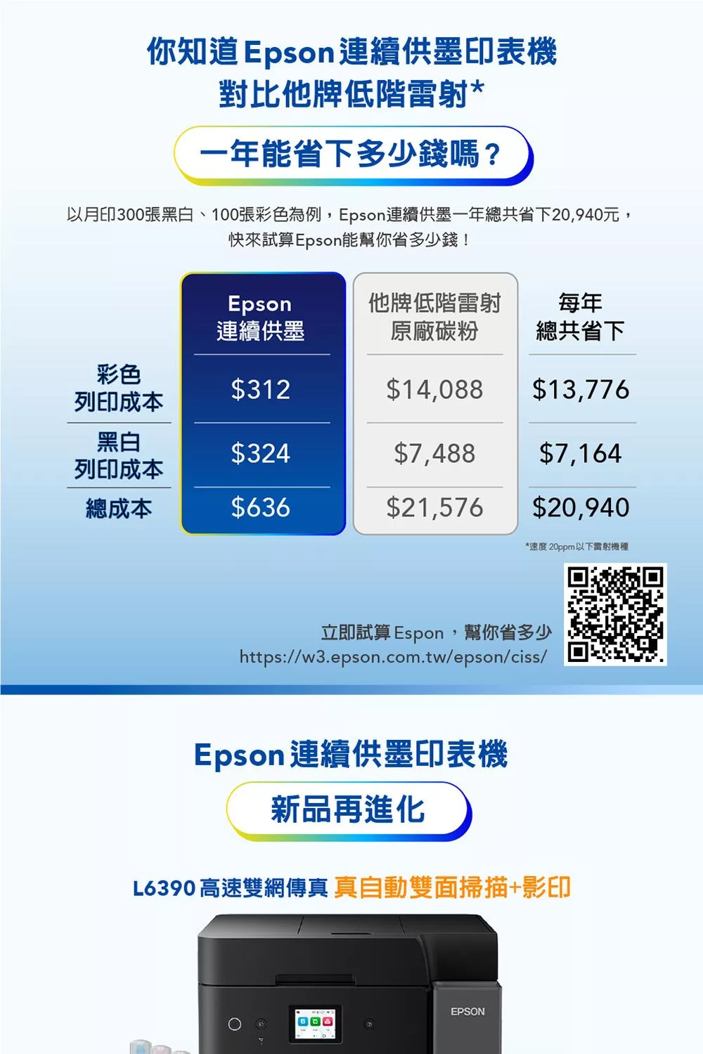 EPSON L6390 高速雙網傳真 智慧遙控連續供墨印表機+T03Y100~400四色墨水三組
