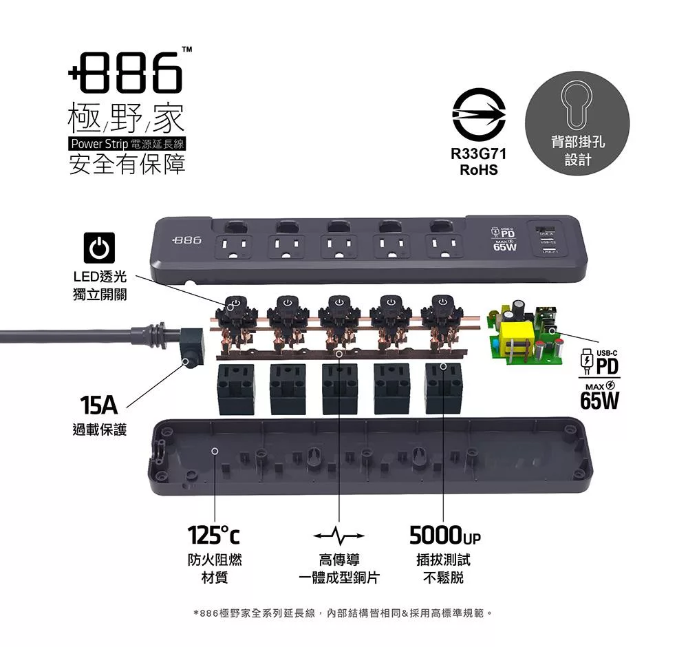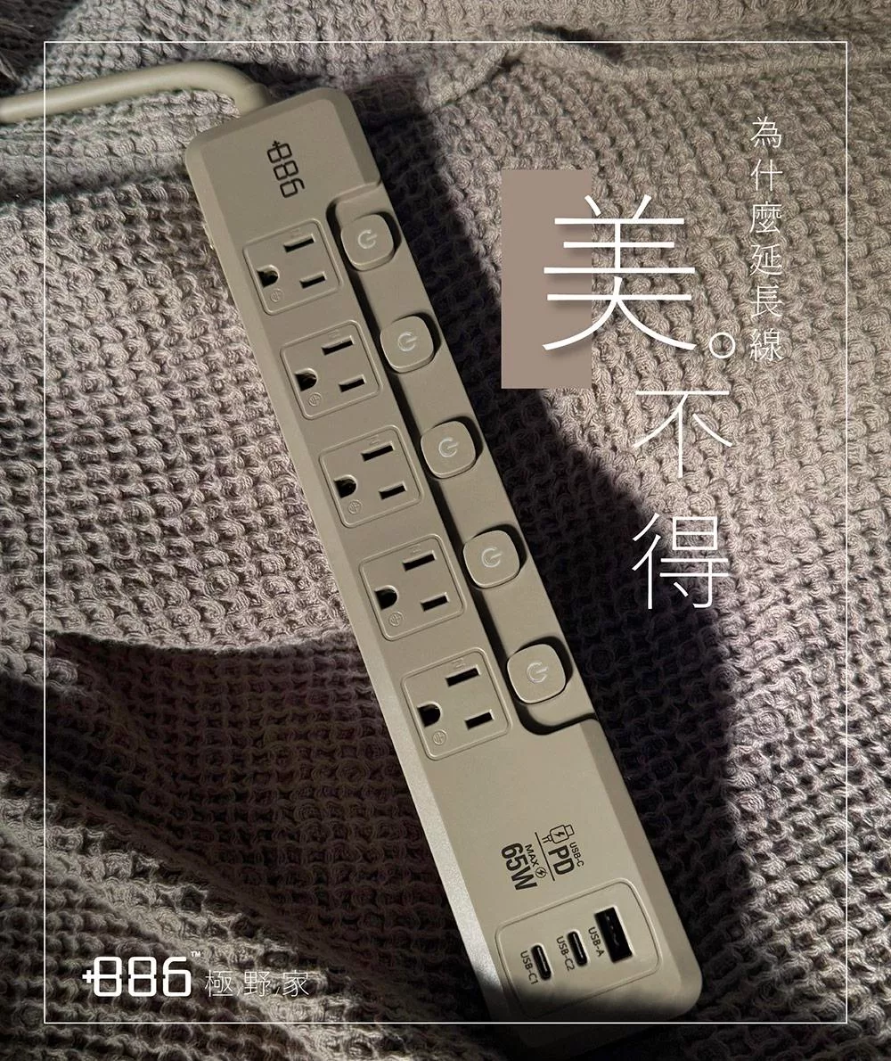 +886 [極野家] 5開5插1USB+2Type C PD 65W 快充延長線1.8米 V2 HPS2556 (3色可選) 迷霧灰