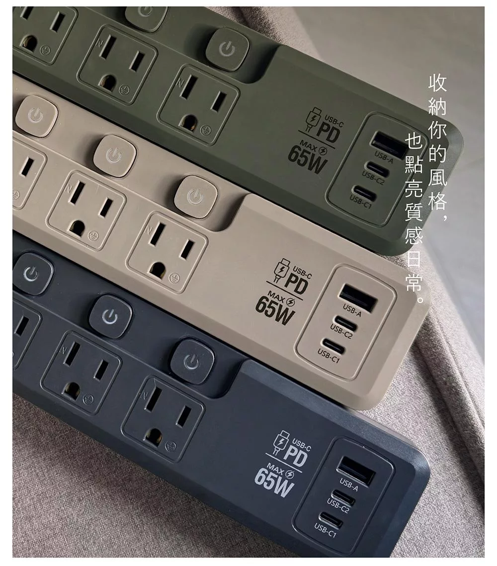 +886 [極野家] 3開3插1USB+2Type C PD 65W 快充延長線1.8米 V2 HPS2336 (3色可選) 軍綠