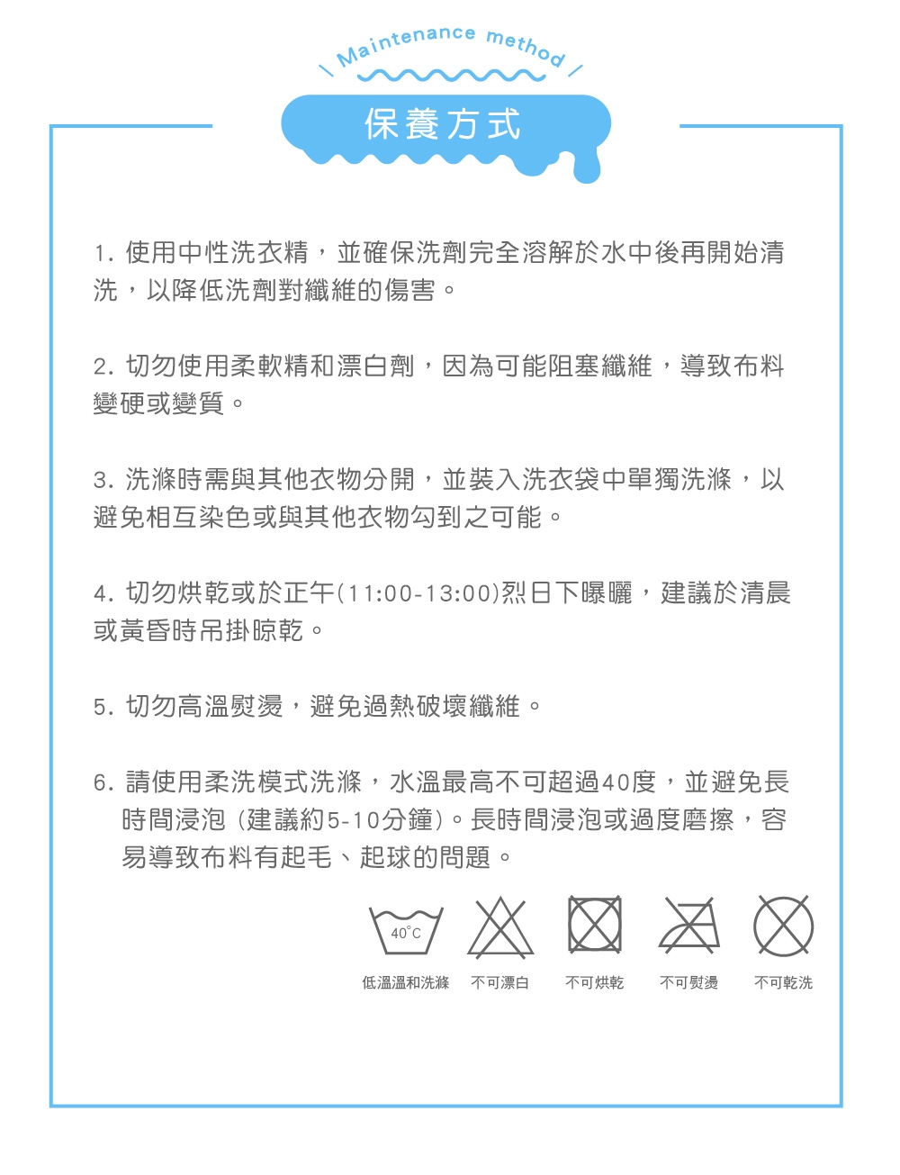 .清潔保養方式:可水洗、可乾洗、不可漂白、不可烘乾。
