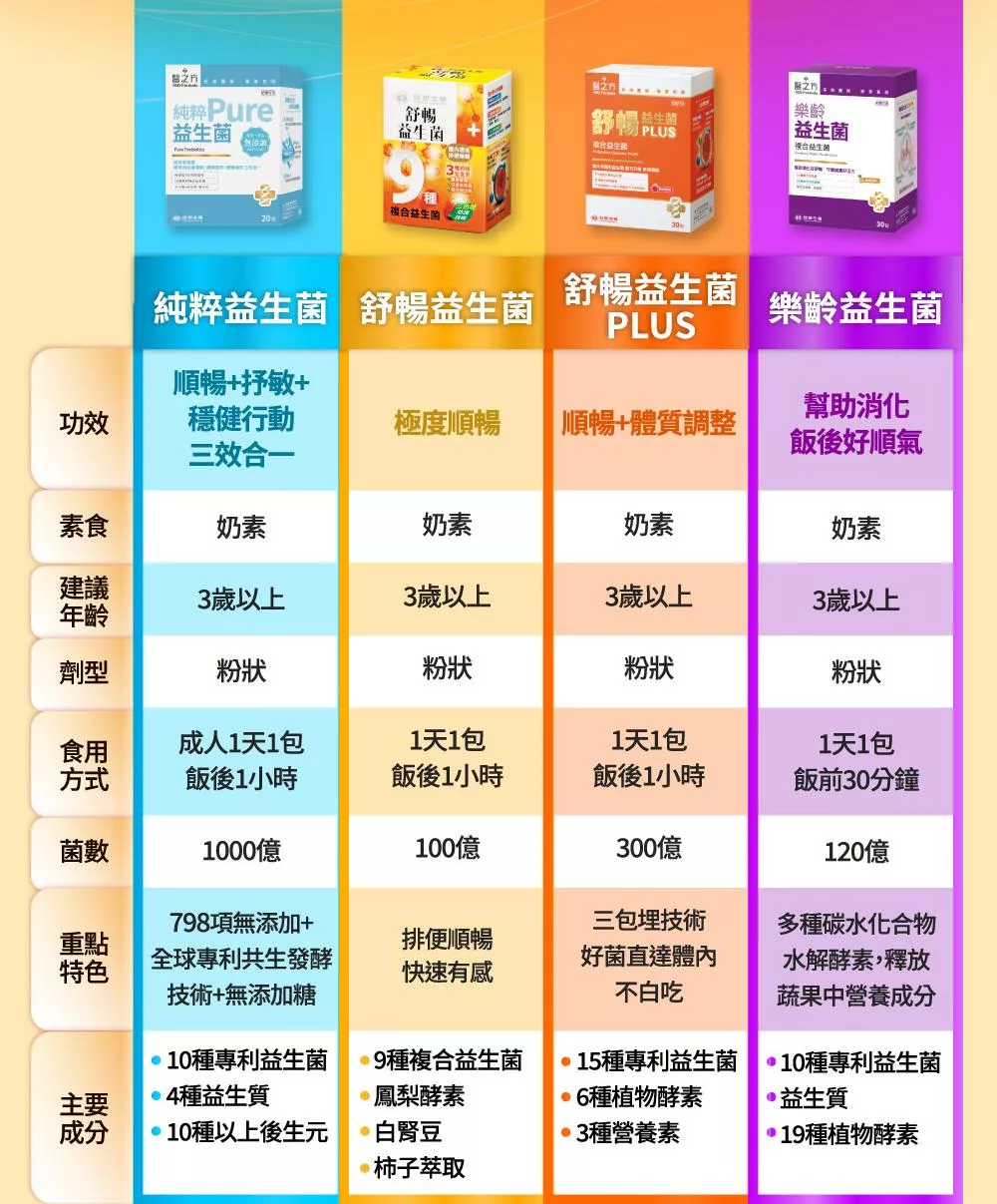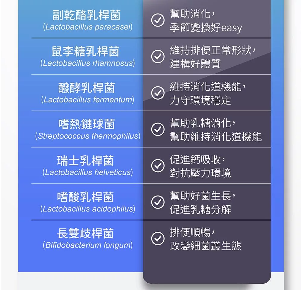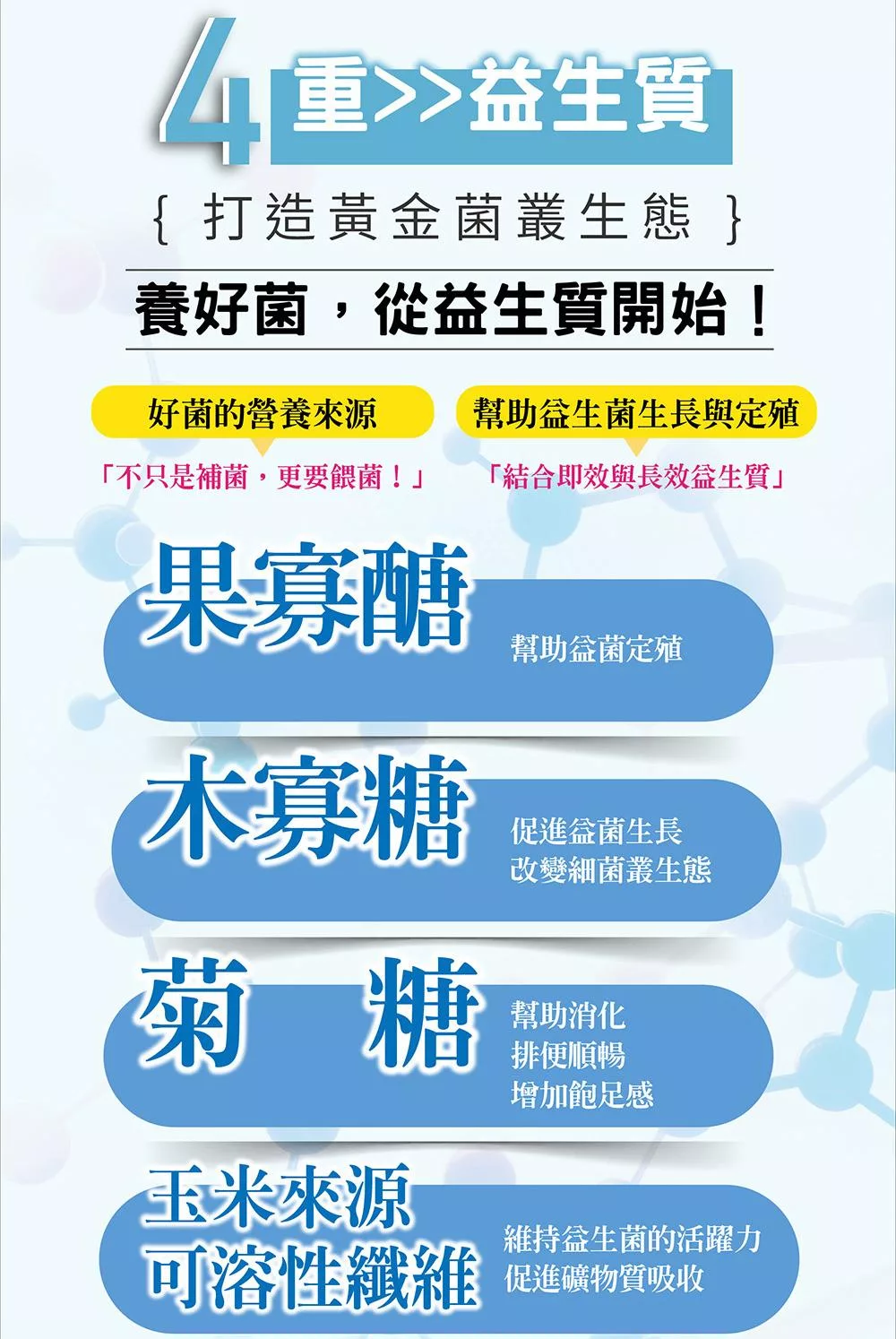 • 【內容物成份】果寡醣粉(非基改玉米澱粉、果寡醣)、乳酸菌 (Lactobacillus plantarum LP28, Lactobacillus fermentum LF26, Lactobacillus paracasei LPC12, Lactobacillus rhamnosus LRH10, Lactobacillus helveticus LH43, Streptococcus thermophilus ST30, Lactobacillus plantarum TWK10, Bifidobacterium longum BL986, Lactobacillus acidophilus LA1063, Lactobacillus rhamnosus LRH113)、木寡糖、菊糖、玉米來源可溶性纖維