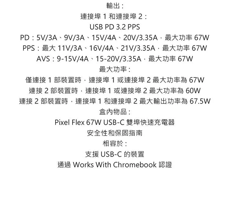 盒內物品:Pixel Flex 67W USB-C 雙埠快速充電器、安全性和保固指南 【本商品不含線材( 請自備 )】