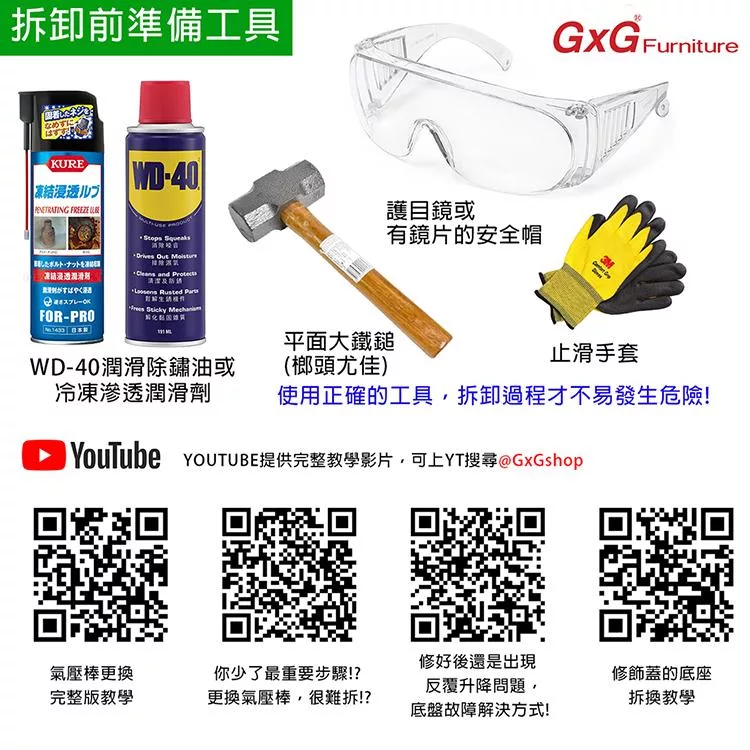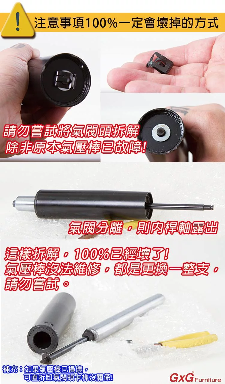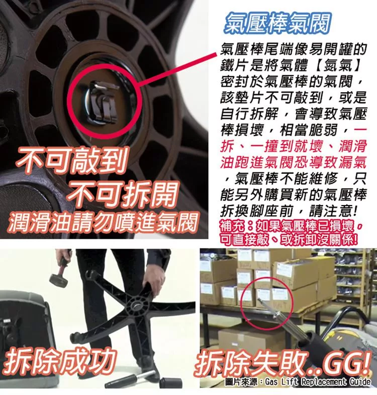 相當脆弱,一 拆、一撞到就壞、潤滑 油跑進氣閥恐導致漏氣 ,氣壓棒不能維修,敲壞能另外購買新的氣壓棒 拆換腳座前,請注意!